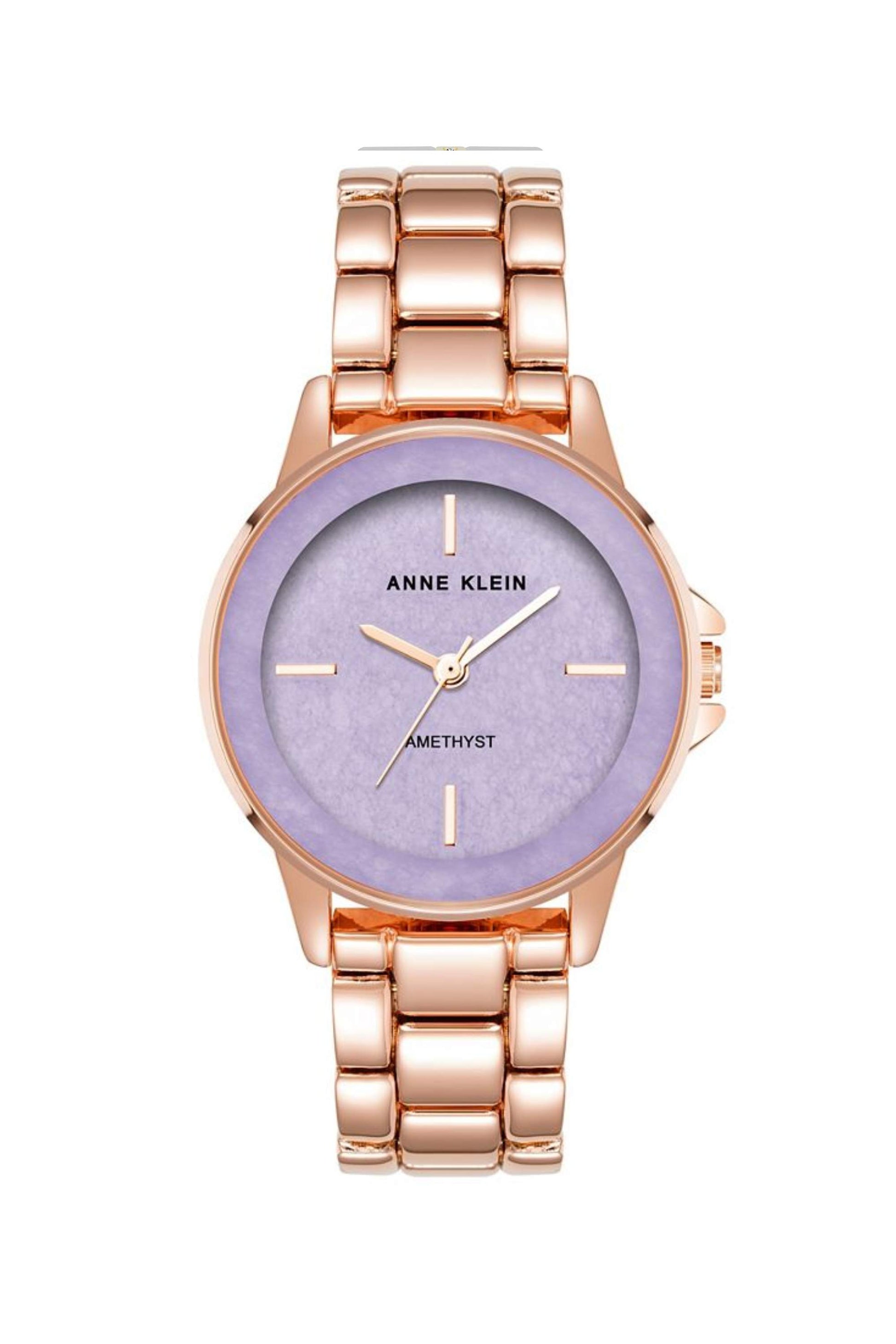 Reloj redondo en oro rosa con una piedra genuina de amatista, ideal para un estilo glamuroso y moderno.