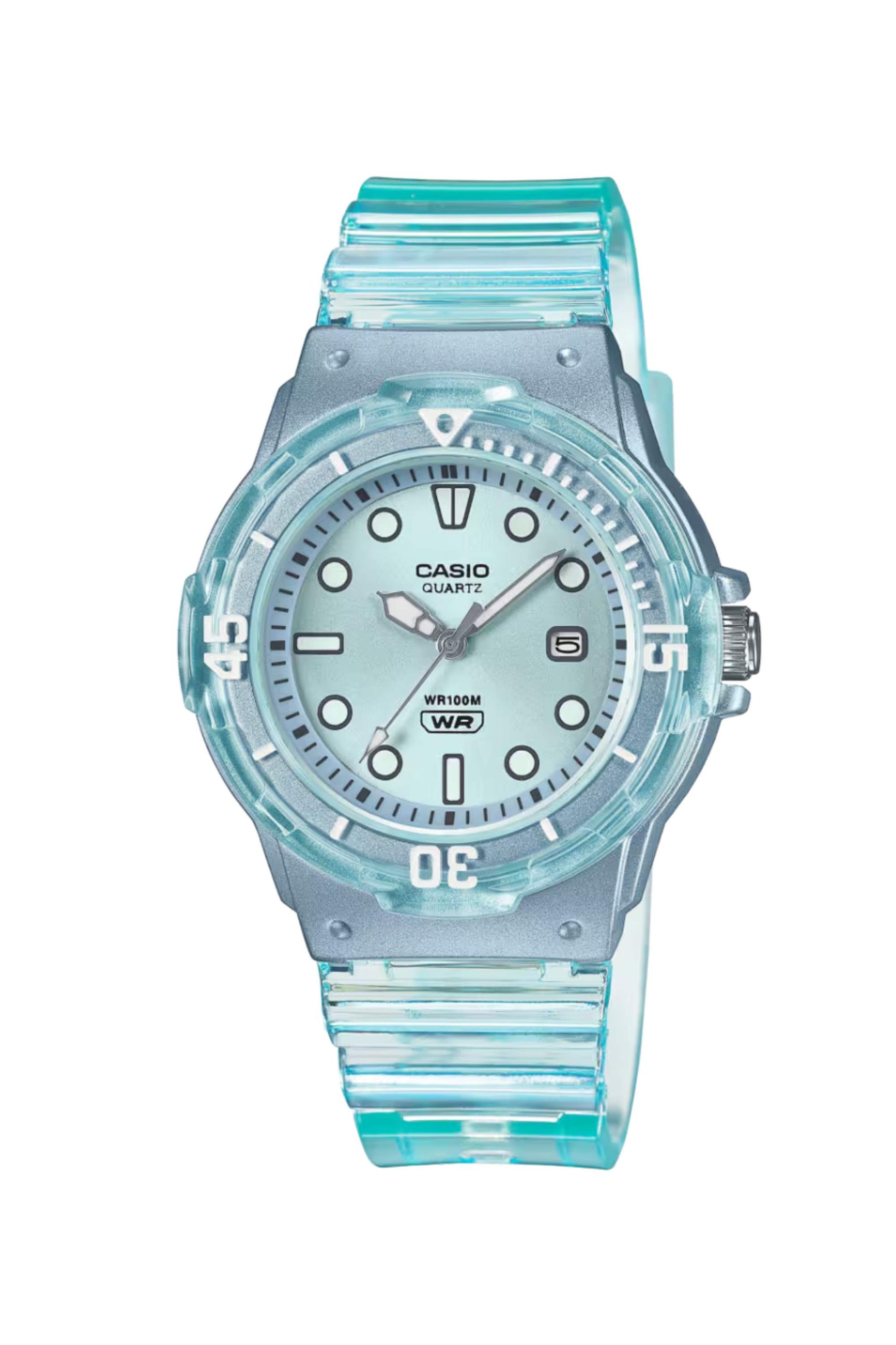 Sumérjase en el brillo y resplandor de un compacto reloj analógico con marco y correa translúcidos.