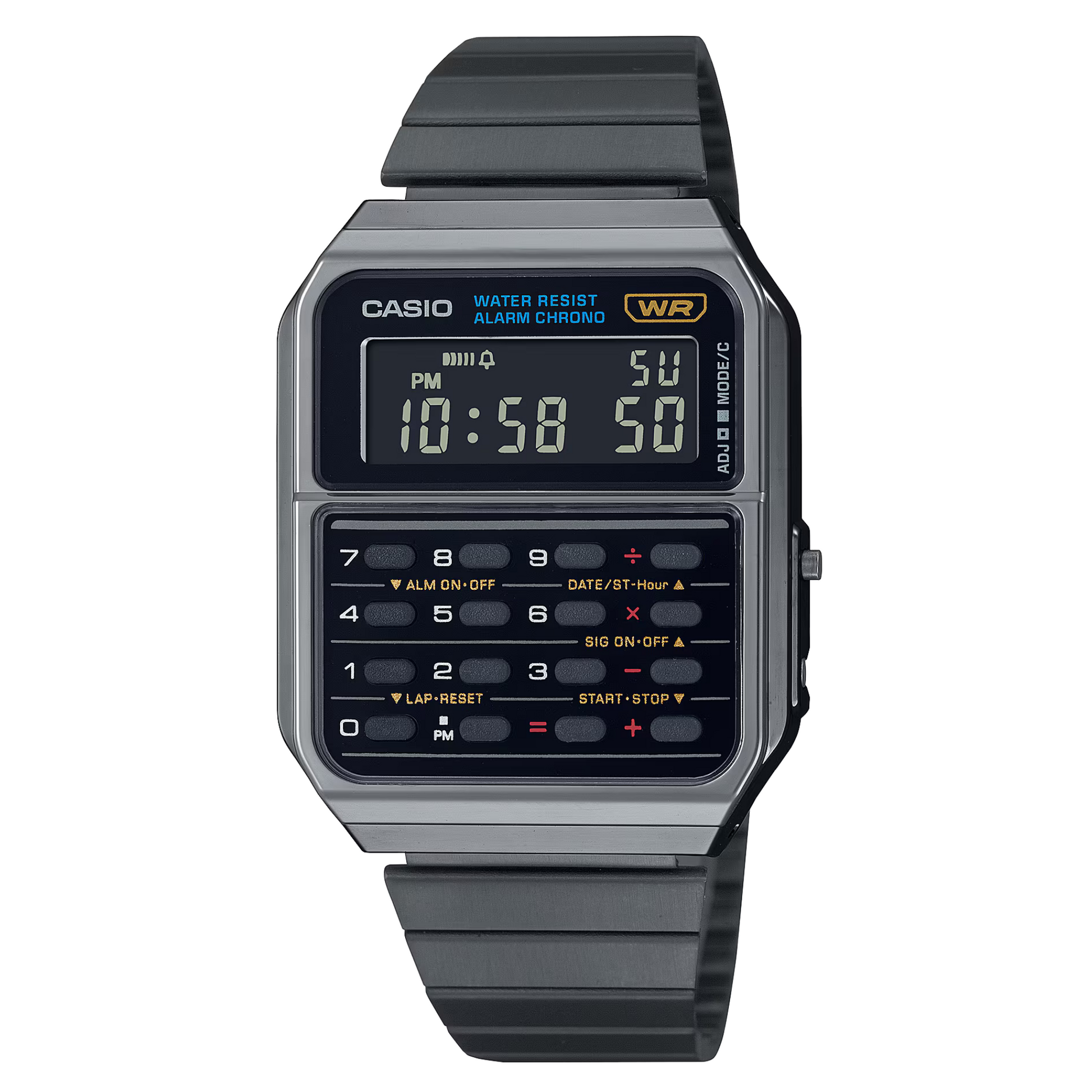 Con una función de calculadora que puede realizar cálculos de 8 dígitos, un cronómetro de 1/100 y una alarma, este reloj aporta un estilo fresco y calculado.