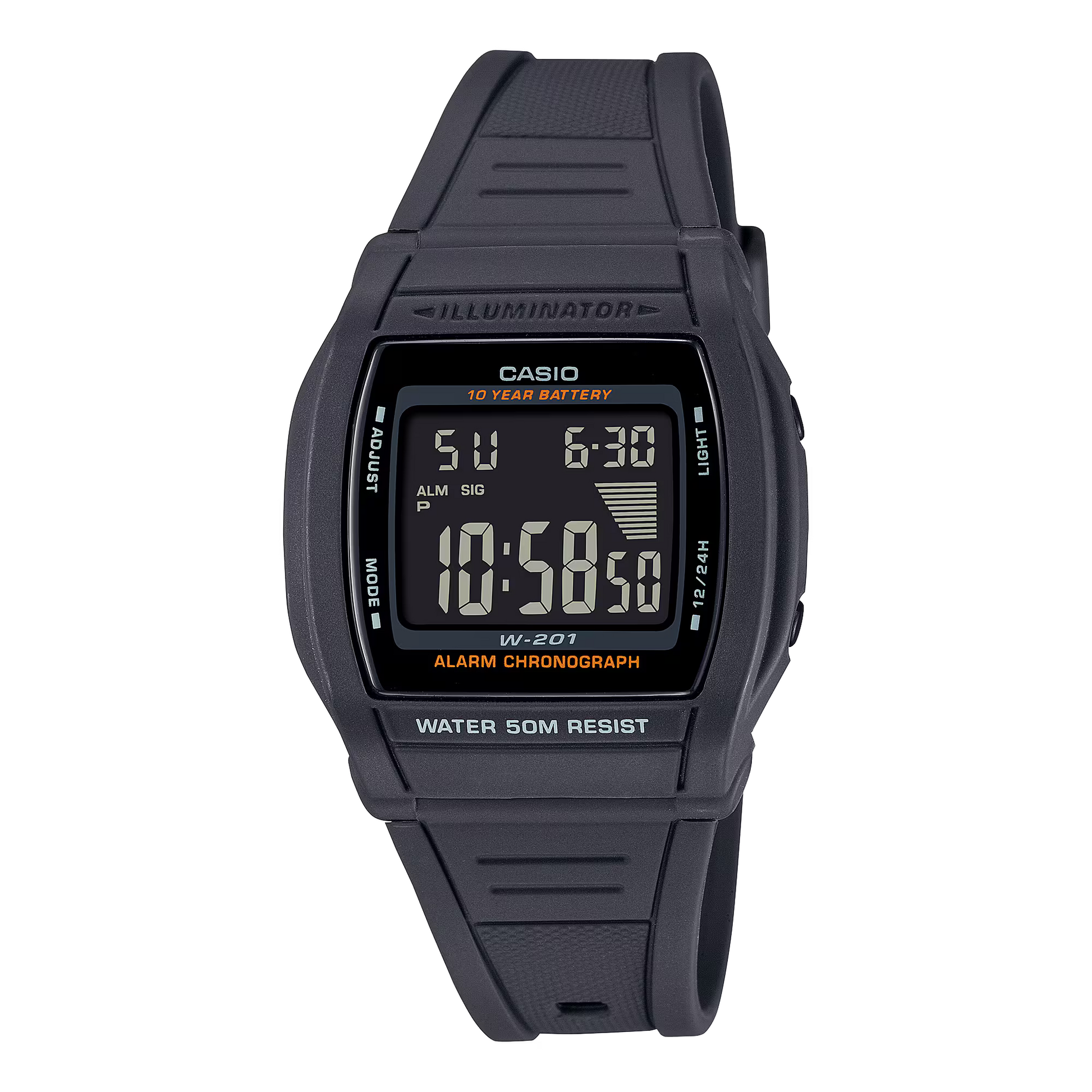 Una funcionalidad práctica y una pantalla audaz se unen en un diseño digital deportivo. El W-201 está equipado con una batería de diez años de duración, tiene una resistencia al agua de 50metros y cuenta con una luz LED para que siempre sepa qué hora es, incluso en la oscuridad.
