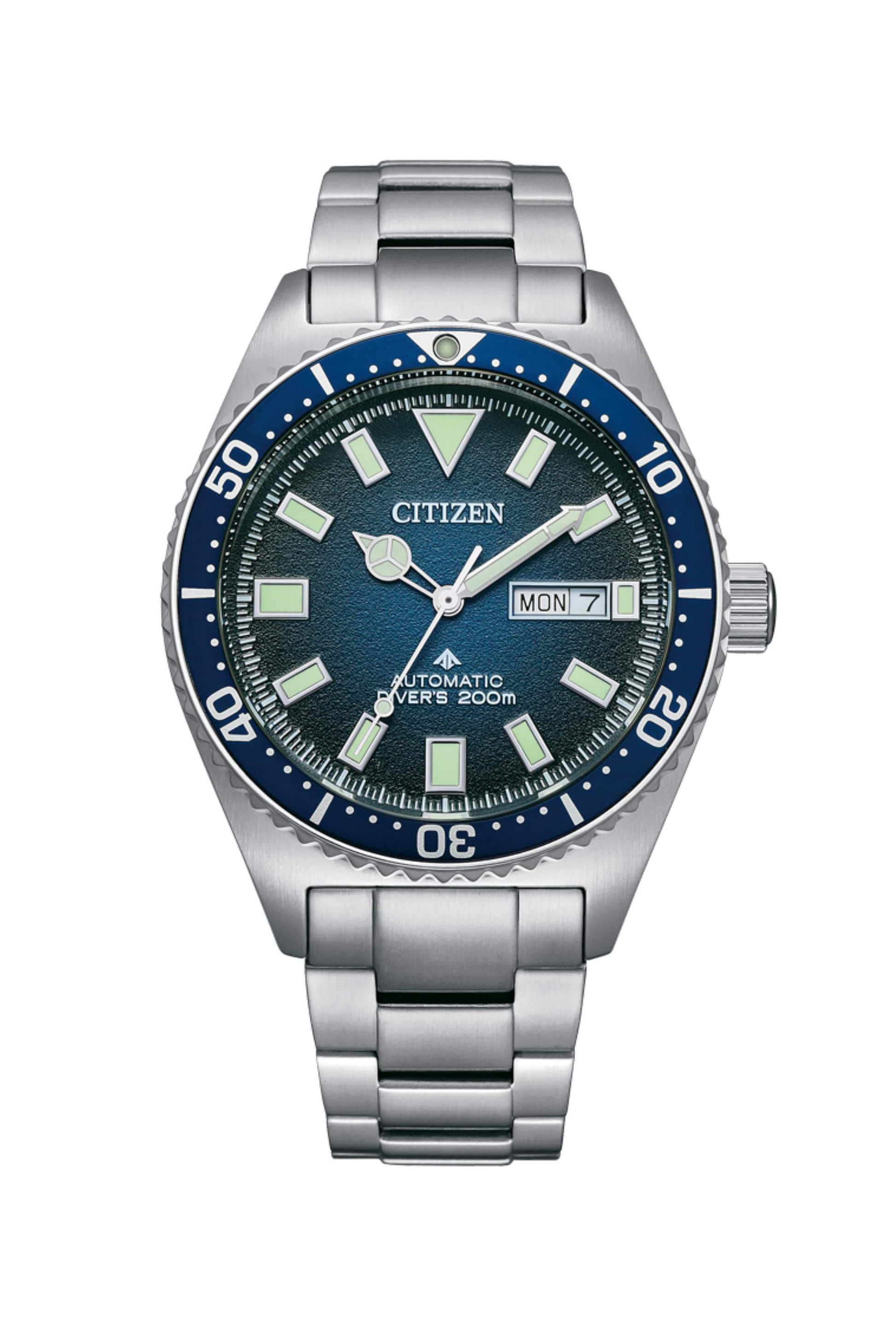 Este reloj de buceo es un nuevo miembro de la Colección Mecánica Citizen. Construido con un movimiento automático y caja y brazalete de acero inoxidable. Con visualización de día y fecha, 200WR y su esfera azul intenso es un reflejo de estilo. WR200 Aprobado ISO 6425 para buceo.