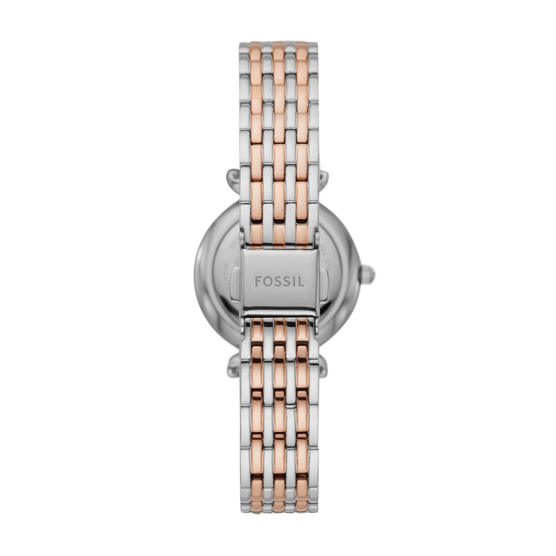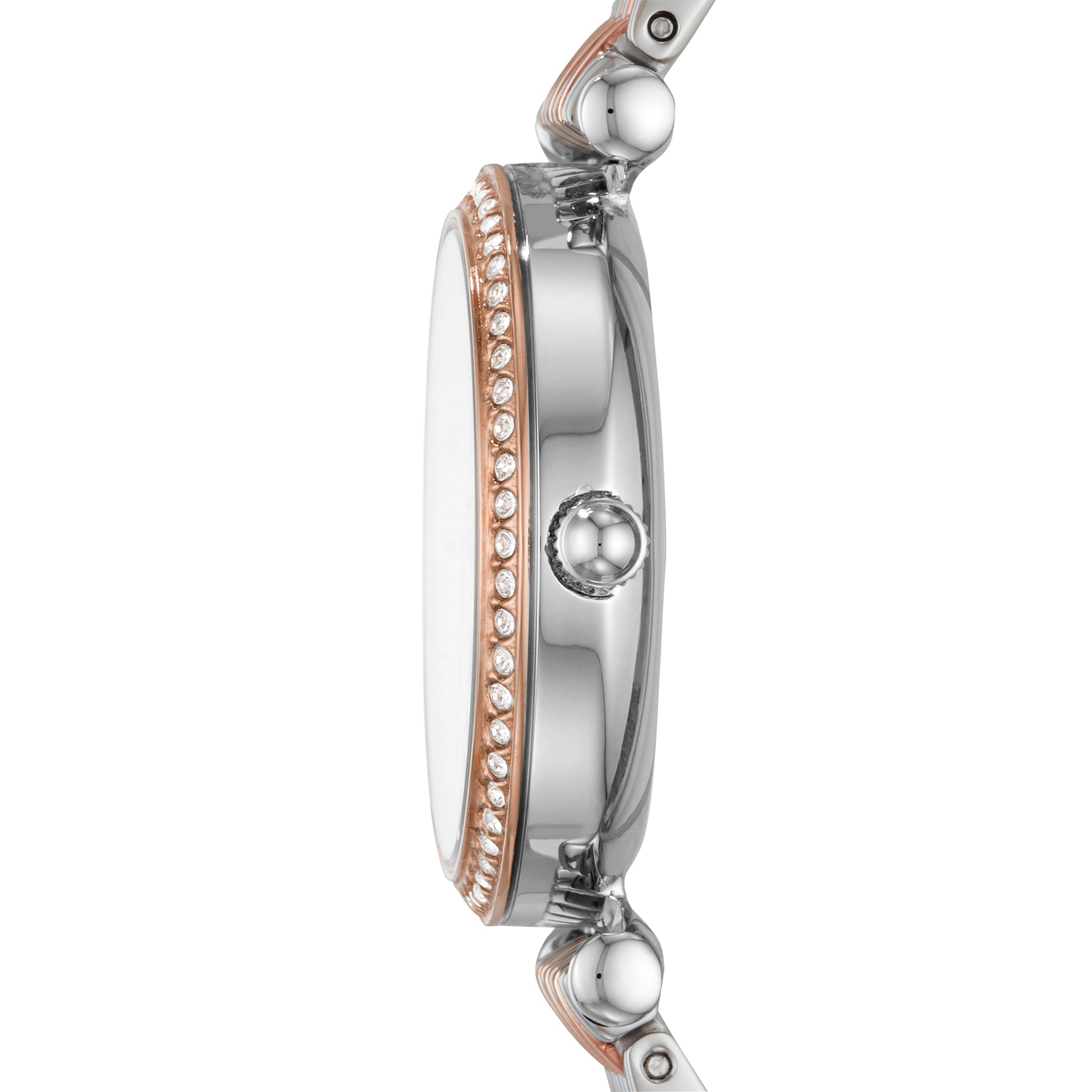 Este Carlie Mini de 28 mm cuenta con una esfera de nácar con un bisel de brillo, movimiento de tres agujas y una pulsera de acero inoxidable bicolor.