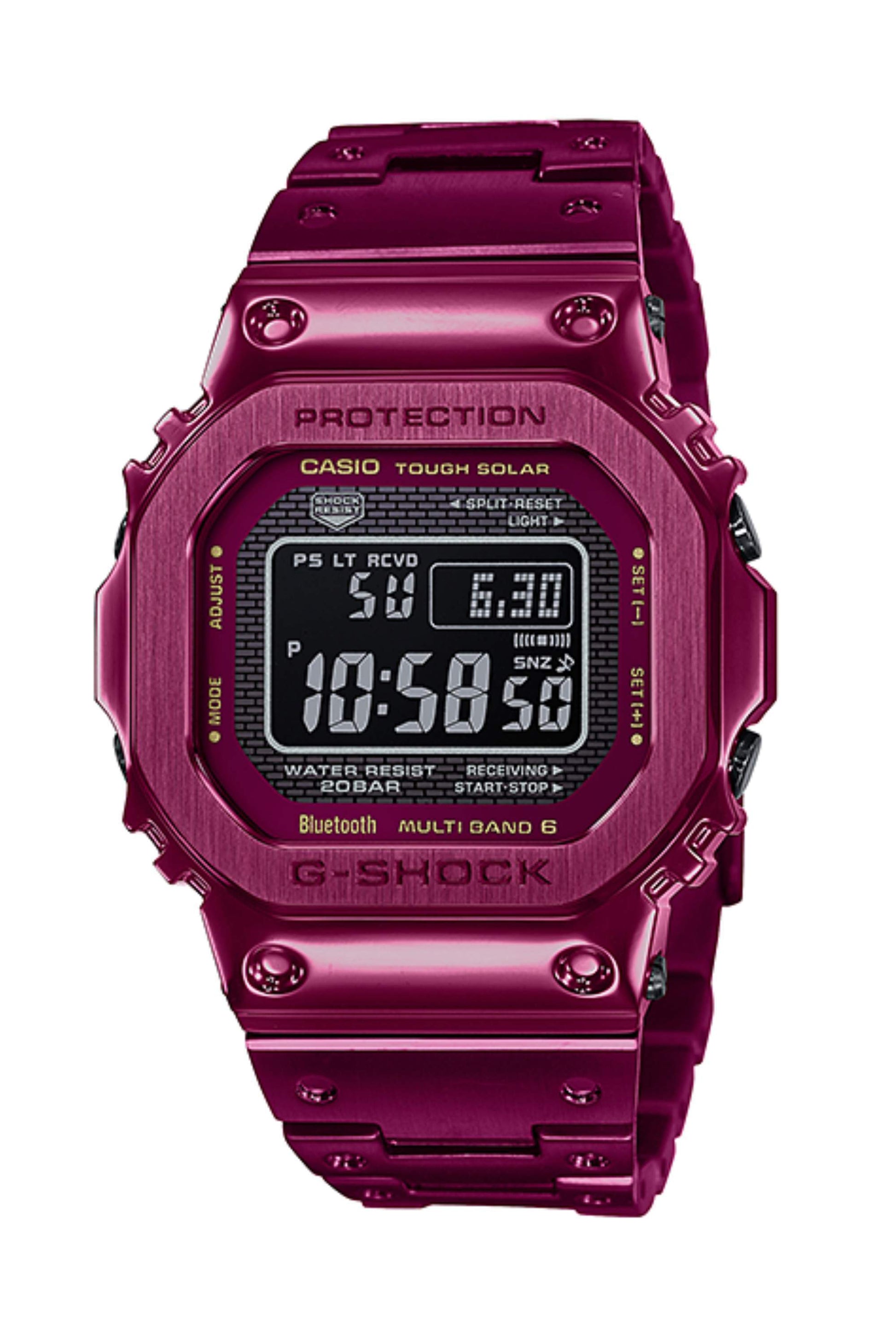 El DW-5000C es el modelo original de G-Shock de 1983. La serie GMW-B5000 heredó su diseño cuadrado característico y recibió un tratamiento completamente metálico junto con funciones actualizadas que incluyen la vinculación con smartphone. El reloj recibió una carcasa completamente metálica mediante el uso de un material de amortiguación de resina fina resistente a impactos insertado entre la carcasa y el sólido marco metálico de acero inoxidable. La tecnología de montaje de alta densidad también permite que el reloj mantenga su tamaño. La parte posterior del reloj presenta una tapa sólida atornillada y se trató con DLC para determinar la resistencia al desgaste. Se aplicó un baño de iones burdeos a toda la carcasa y la correa para lograr un color hermoso de la marca G-Shock. También se mejoró la visibilidad con el uso de una película de celda solar y una LCD STN (cristal líquido). Respecto a las funciones, este modelo viene con comunicación Bluetooth® y permite vincularse con una aplicación exclusiva para obtener información precisa sobre la hora. El reloj también cuenta con funciones prácticas que incluyen un sistema de corrección de hora que utiliza señales estándar de hora y frecuencia (Multiband6), una fuente confiable de energía en forma de tecnología Tough Solar, luz de fondo LED completamente automática de alta luminosidad, hora mundial y visualización de días de la semana en seis idiomas. Este es un modelo G-Shock que se mantiene fiel a su predecesor mientras se somete a un refinamiento adicional a través de la implementación de un diseño completamente metálico.