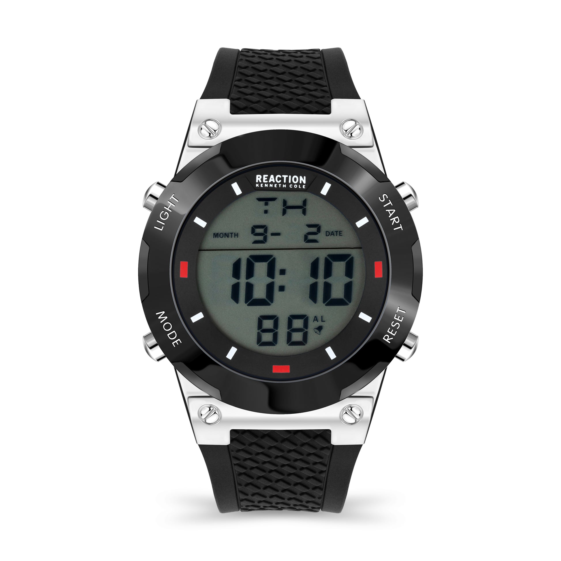 Un reloj digital en plateado con detalles en resina negra, perfecto para los hombres que buscan un accesorio moderno y elegante.