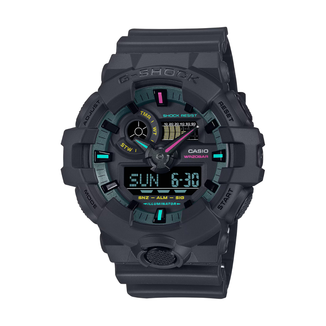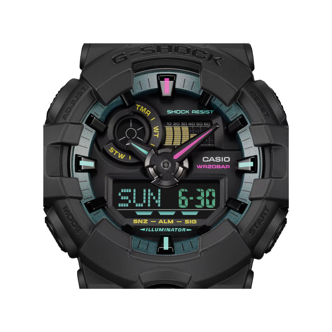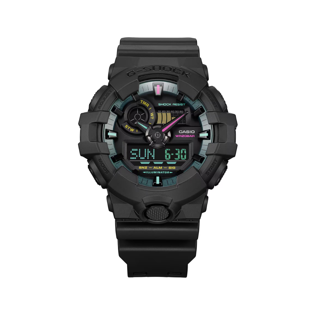 Estos resistentes relojes G-SHOCK con detalles fluorescentes combinan un negro intenso con colores vibrantes. El bisel y la correa en negro mate contrastan elegantemente con los toques de azul, rosa y amarillo intensos en las manecillas, los marcadores de hora y las esferas, transportándole a un mundo virtual. Divertidos y llamativos, estos diseños destacarán en cualquier escena de moda. Elije tu favorito entre cinco relojes: el GA-100, el GA-110 o el GA-700 con caja grande; el GA-B2100 con bisel octogonal, además de Bluetooth y carga solar, o el reloj digital GX-56 con caja grande. El negro mate y los colores fluorescentes se unen en una combinación que destaca. ¿Con cuál te quedas tu?