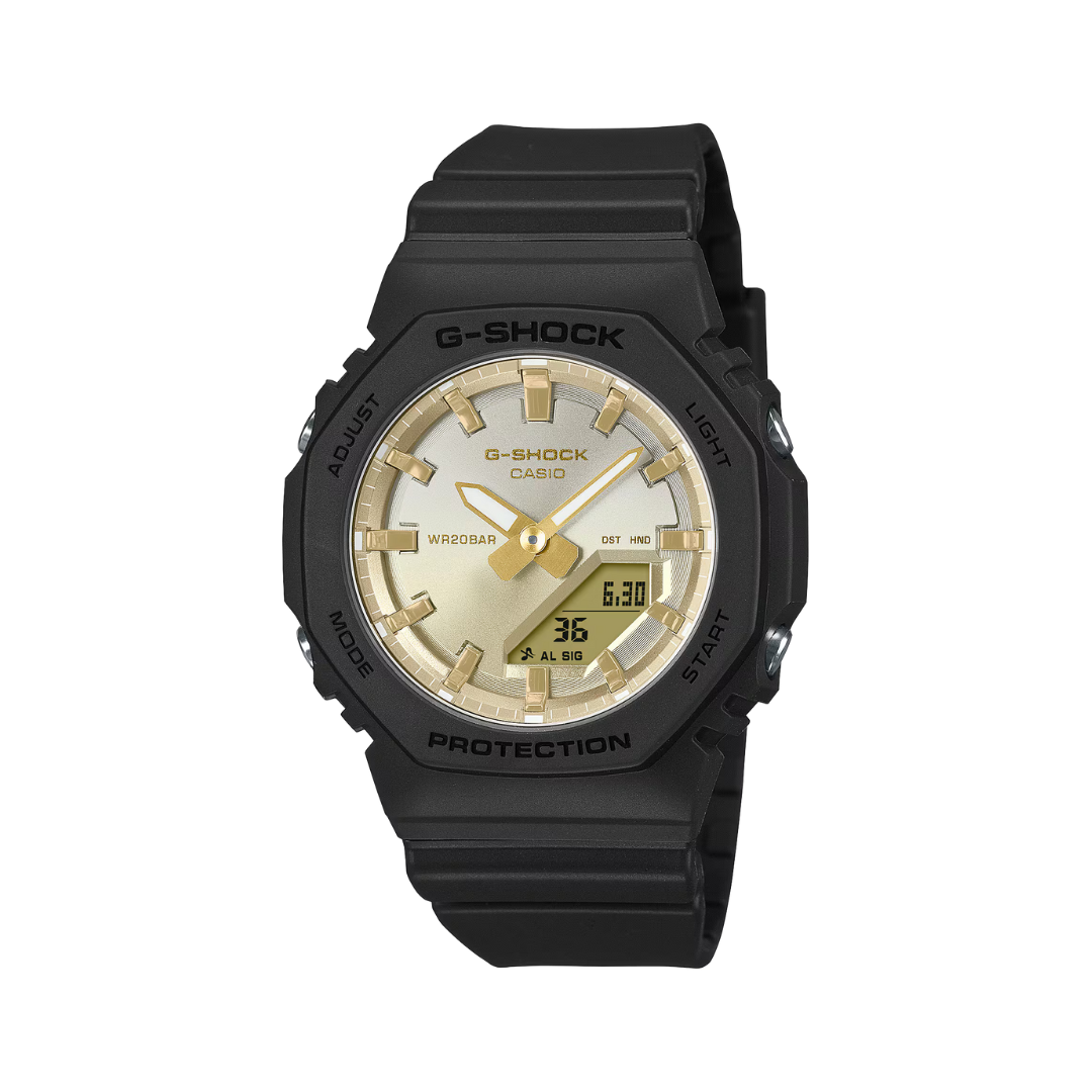 Imprégnese del resplandor de un reloj inspirado en las hermosas puestas de sol de verano. El brillo del sol que desciende sobre el agua al final de un bello día de verano se captura mediante la deposición de vapor en una lustrosa gradación de nuevos colores en el dial. Comenzamos con el GMA-P2100, una versión aún más compacta de la popular combinación digital-analógica del GMA-S2100, y ajustamos la longitud de la correa para adaptarse mejor a muñecas más delgadas. Eliminamos el dial incorporado original en la posición de las 9 para lograr un aspecto aerodinámico y minimalista, y utilizamos acero inoxidable para la hebilla y los botones laterales a fin de agregar un toque de lujo. Los componentes clave de resina utilizados en el marco y la correa están hechos con resina de base biológica. Se espera que este material, producido con recursos orgánicos renovables, ayude a reducir el impacto ambiental. Las nuevas combinaciones de colores le dan un estilo de centro vacacional de lujo a su muñeca y atuendo, mientras que los materiales ecológicos mantienen la belleza de la playa en el centro.