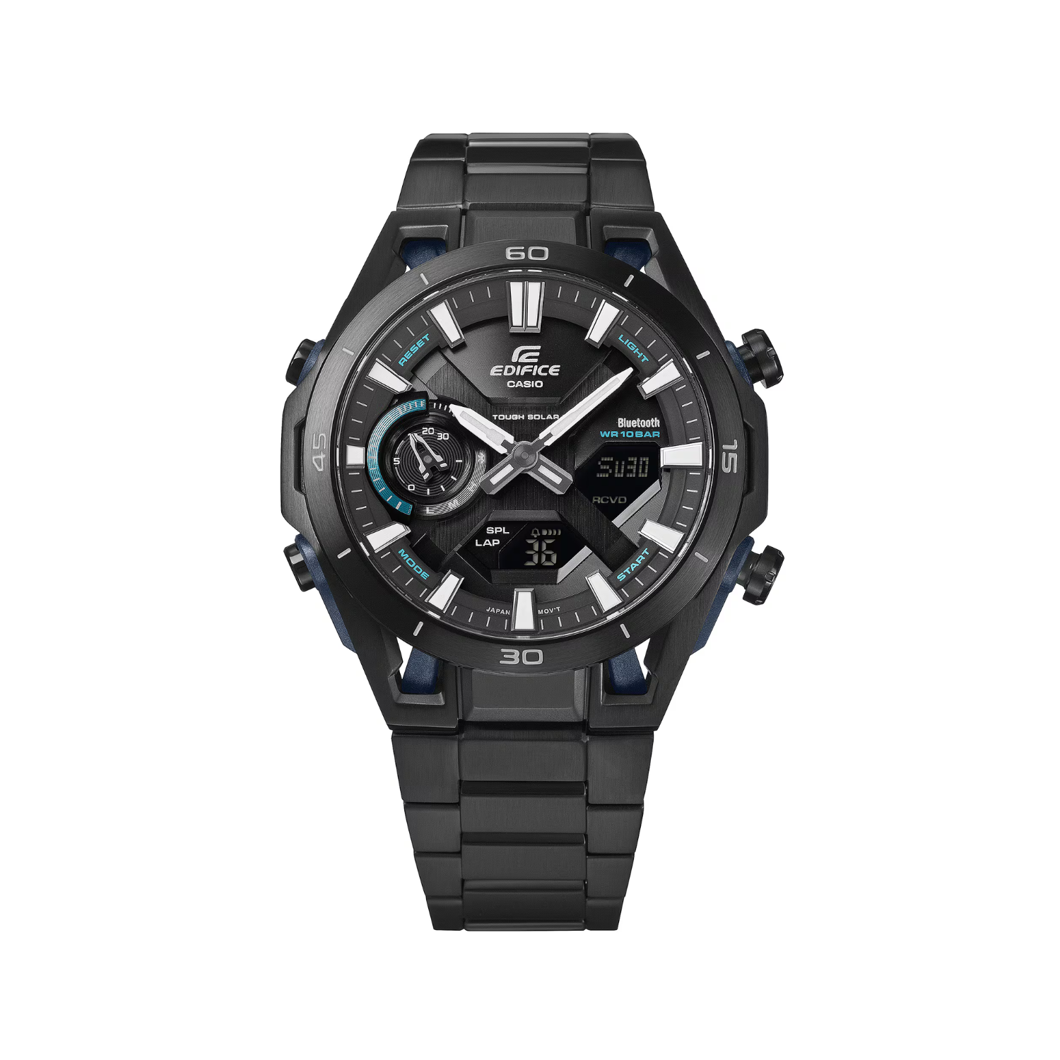 Tecnología Tough Solar garantiza autonomía energética sostenible, mientras que la conectividad Bluetooth permite sincronización automática con su smartphone, ajuste de hora mundial y funciones adicionales. Con resistencia al agua hasta 100 metros, movimiento de cuarzo de precisión y brazalete de acero inoxidable, este cronógrafo digital combina durabilidad y elegancia contemporánea.
