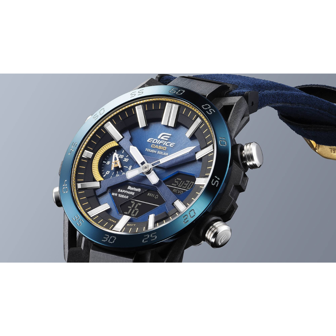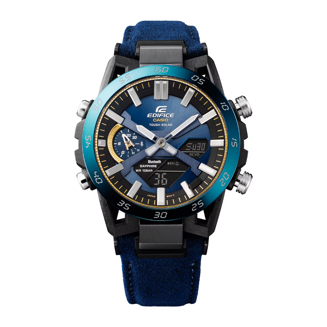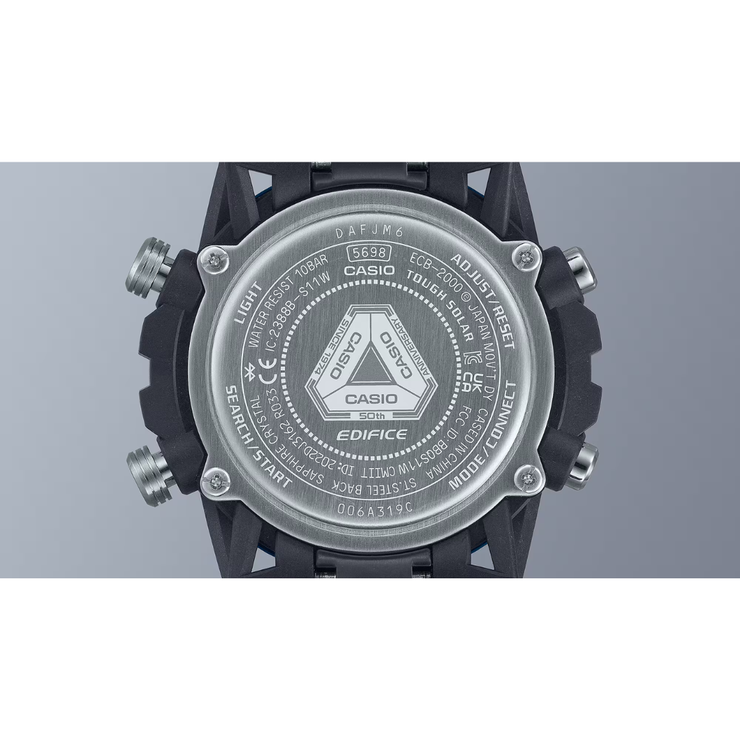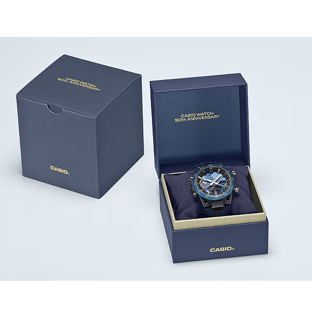 Celebre los 50 años de los relojes Casio con un impresionantemente atractivo EDIFICE que simboliza la determinación de Casio de mantenerse fiel a su esencia, a la vez que innova de manera continua. El ECB-2000SS SOSPENSIONE, con su distintivo diseño de brazo de suspensión, presenta colores, materiales y acabados de Casio en la combinación de colores conmemorativa especial del 50.º aniversario y un diseño que evoca la naturaleza omnipresente y en constante cambio del cielo, el mar y la luz del sol, que brillan hoy y siempre. La correa está fabricada con Alcantara, un material reconocido internacionalmente que se espera que ayude a reducir el impacto ambiental. La resina reforzada con fibra de carbono utilizada para la carcasa ofrece resistencia y ligereza. La parte posterior de la carcasa está grabada con un logotipo original creado para celebrar el 50.º aniversario de los relojes Casio. Más que belleza, este reloj también proporciona una funcionalidad superior. Gracias al Bluetooth, la carga solar, la luz de alto brillo y el cristal de zafiro resistente a los rayones y muy transparente, estará preparado para todo lo que se le ponga por delante. Acceda a la aplicación para teléfono inteligente a fin de ajustar automáticamente la hora correcta y disfrutar de la operación del reloj sin complicaciones, incluidas la hora mundial y la alarma. Celebre este aniversario tan especial con el ECB-2000SS EDIFICE conmemorativo, la encarnación misma de los orígenes de los relojes Casio y del medio siglo de innovación revolucionaria que les siguió.