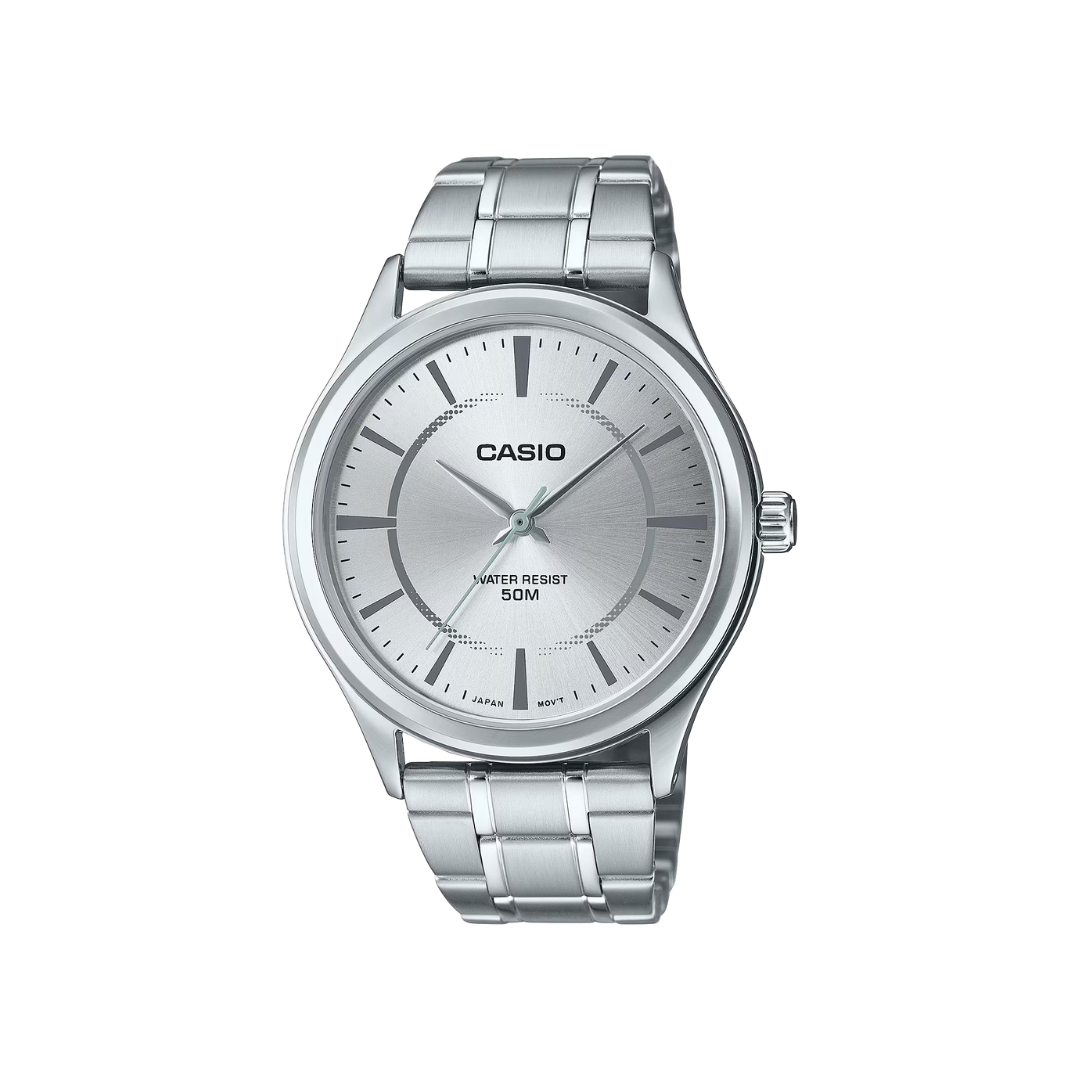 El reloj analógico de metal clásico con marcadores de índice en barras y un esquema de color monocromático, simplificado para un aspecto minimalista.