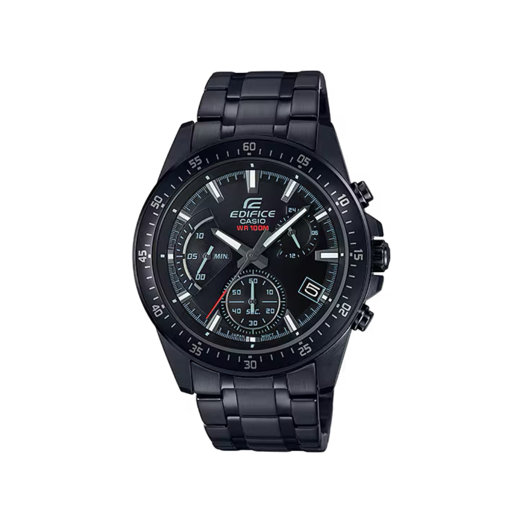 Un cronógrafo EDIFICE estándar de tamaño medio. Partes del bisel, las agujas, los índices y el interior de la esfera son de color azul para crear un diseño deportivo.
