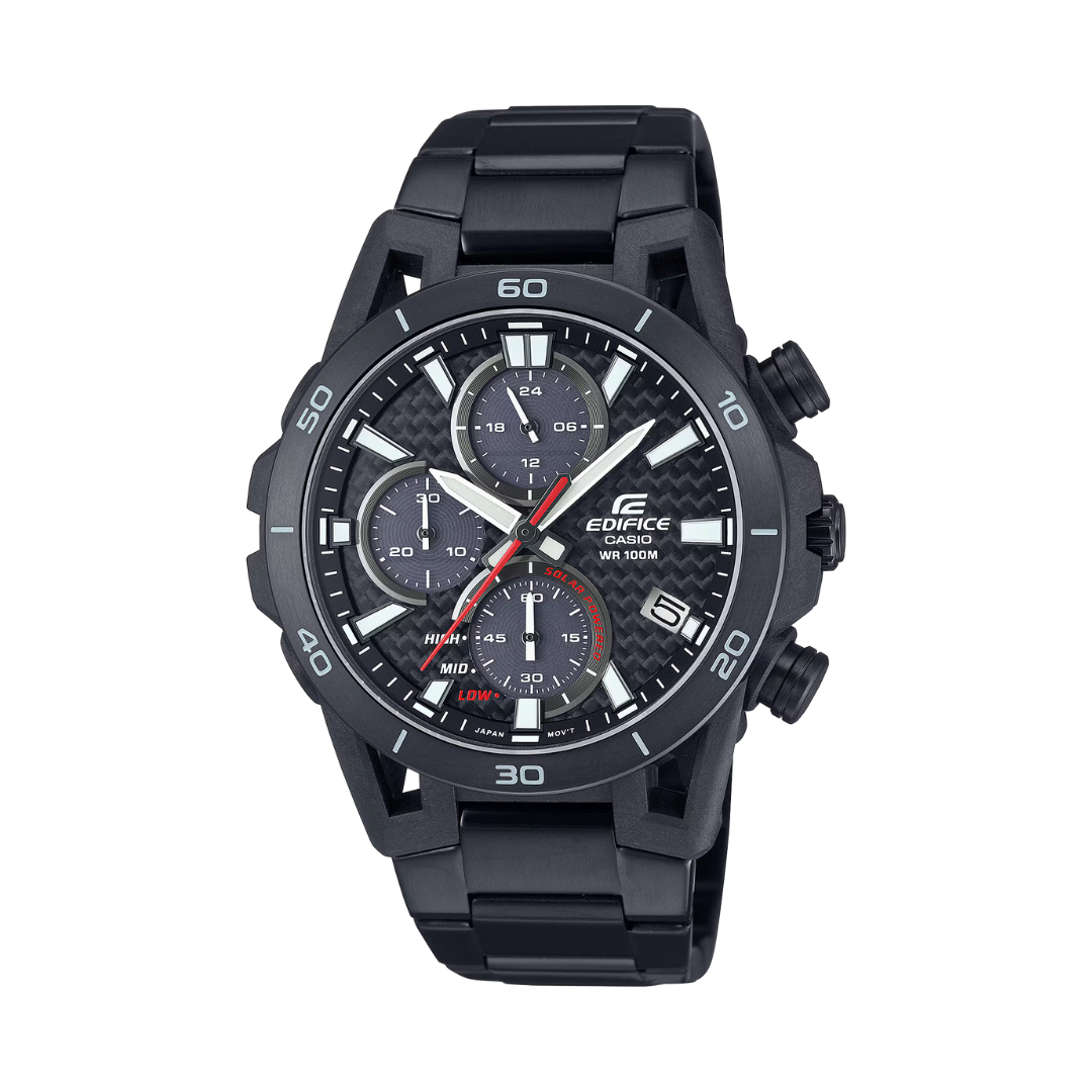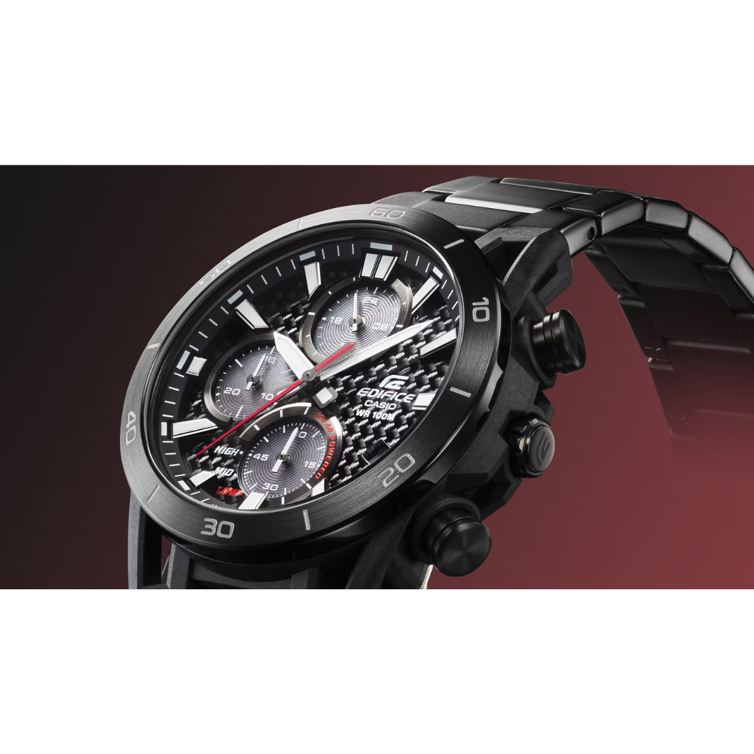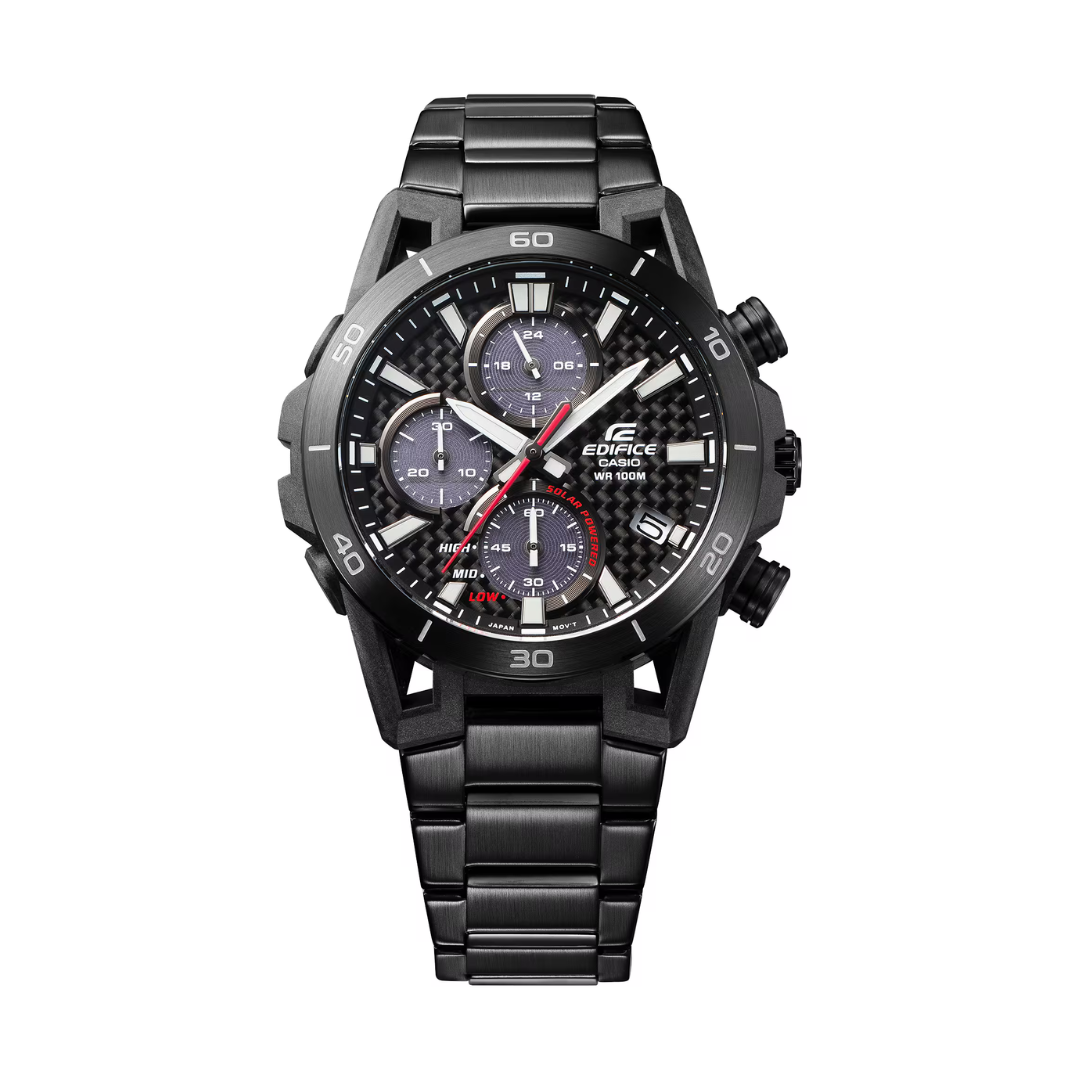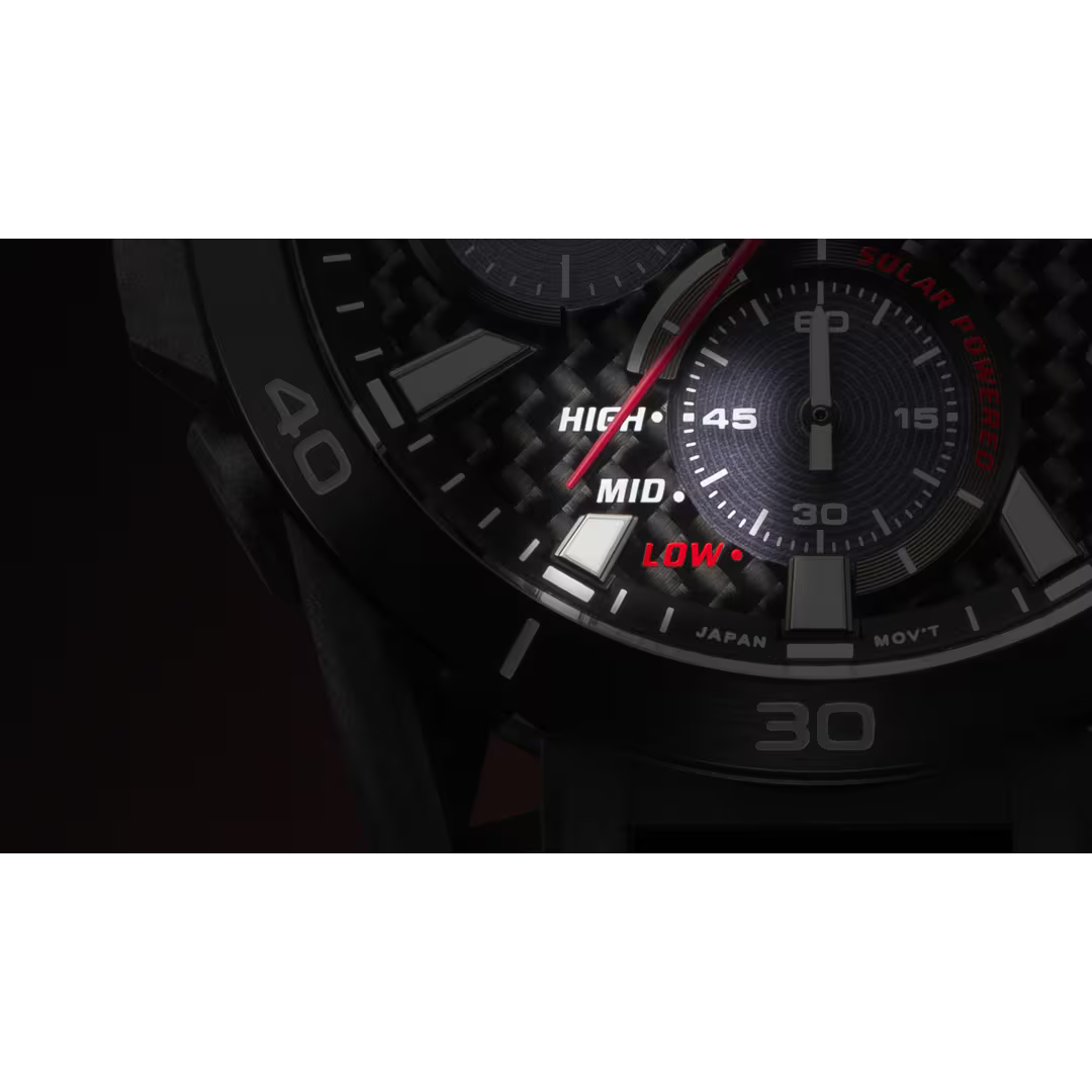 Perfeccione su estilo y sofisticación con un cronógrafo solar que cuenta con una carcasa de resina reforzada con fibra de carbono con un diseño de brazo en suspensión, además de una esfera de fibra de carbono. Llevando el concepto de deportes de motor de alto rendimiento hasta la línea de meta, los paneles solares están meticulosamente diseñados para atraer mucha luz a través de las pequeñas aberturas de las esferas incrustadas, generando suficiente energía para mantener este reloj en funcionamiento en condiciones normales durante unos cinco meses cuando está completamente cargado. La carcasa de resina reforzada con fibra de carbono es ligera, pero resistente, y emplea un diseño de lengüeta inspirado en la suspensión de cuatro brazos y doble horquilla de los coches de fórmula. El diámetro más pequeño de la carcasa permite un ajuste fácil y cómodo. Se trata de un reloj que encarna la Velocidad e Inteligencia de la línea EDIFICE con una sofisticada combinación de materiales, diseño y funcionalidad.