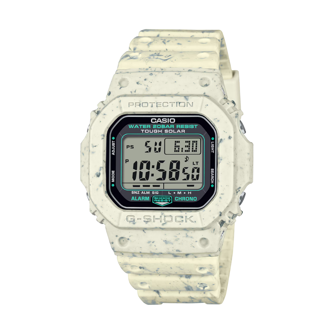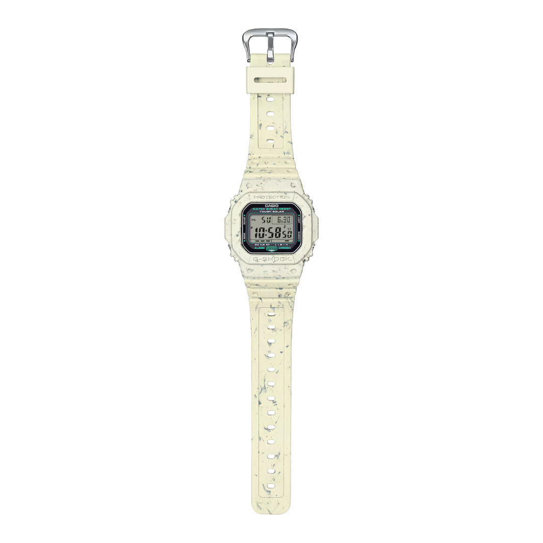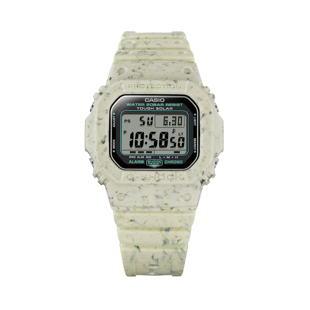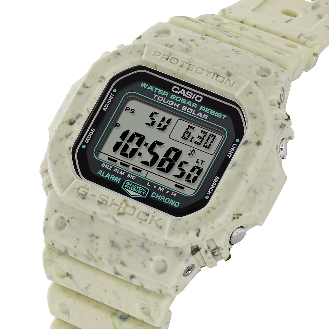 El G-5600BG-5 aprovecha al máximo la resina de la fabricación de componentes para otros relojes. La resina residual en blanco y verde oliva se pulveriza y moldea para formar una base beige, lo que crea un diseño especial con un patrón único y con colores sutiles. Es la compañía perfecta para cualquier ocasión: desde diversión diaria hasta eventos estilosos. Equipado con G-5600 Tough Solar, que carga la batería del reloj incluso con pequeñas cantidades de luz interior, y una esfera y correa fabricadas con restos de resina reciclada, este reloj manifiesta completamente su compromiso de ayudar a reducir el impacto ambiental. Nota: El color y el patrón exactos pueden variar de un reloj a otro debido a las características específicas del producto.
