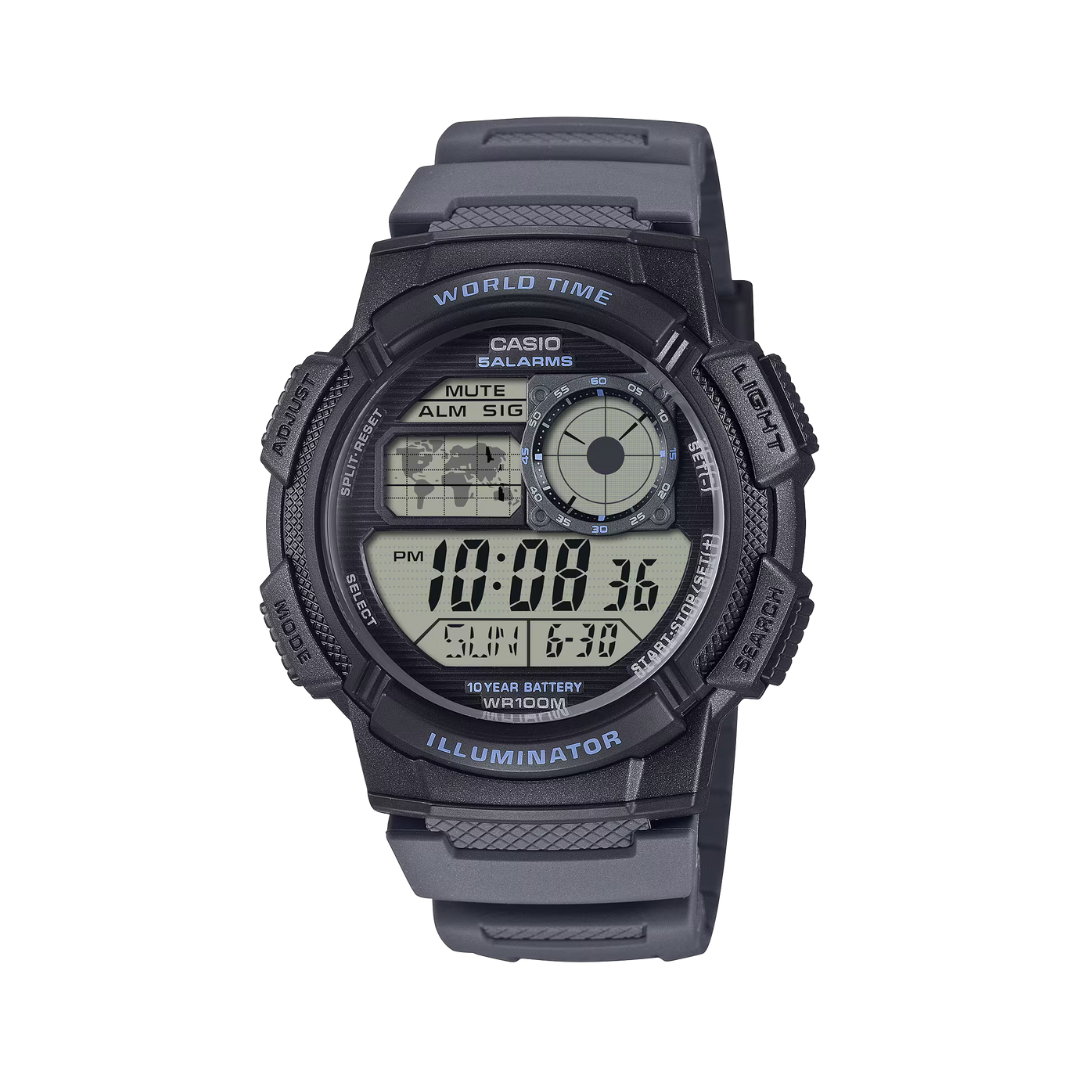 Un diseño robusto e inspirado en la aviación, con una batería de 10 años. Con indicadores tipo cabina de avión, hora mundial con mapa, pantalla analógica LCD y resistencia al agua de 10 bares, este modelo combina duración, estilo técnico y funcionalidad.