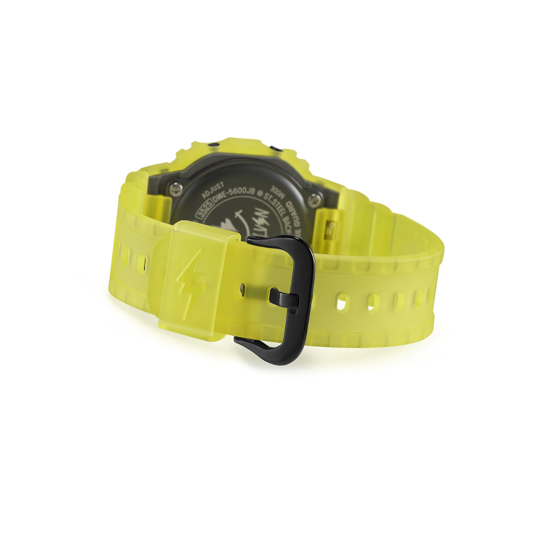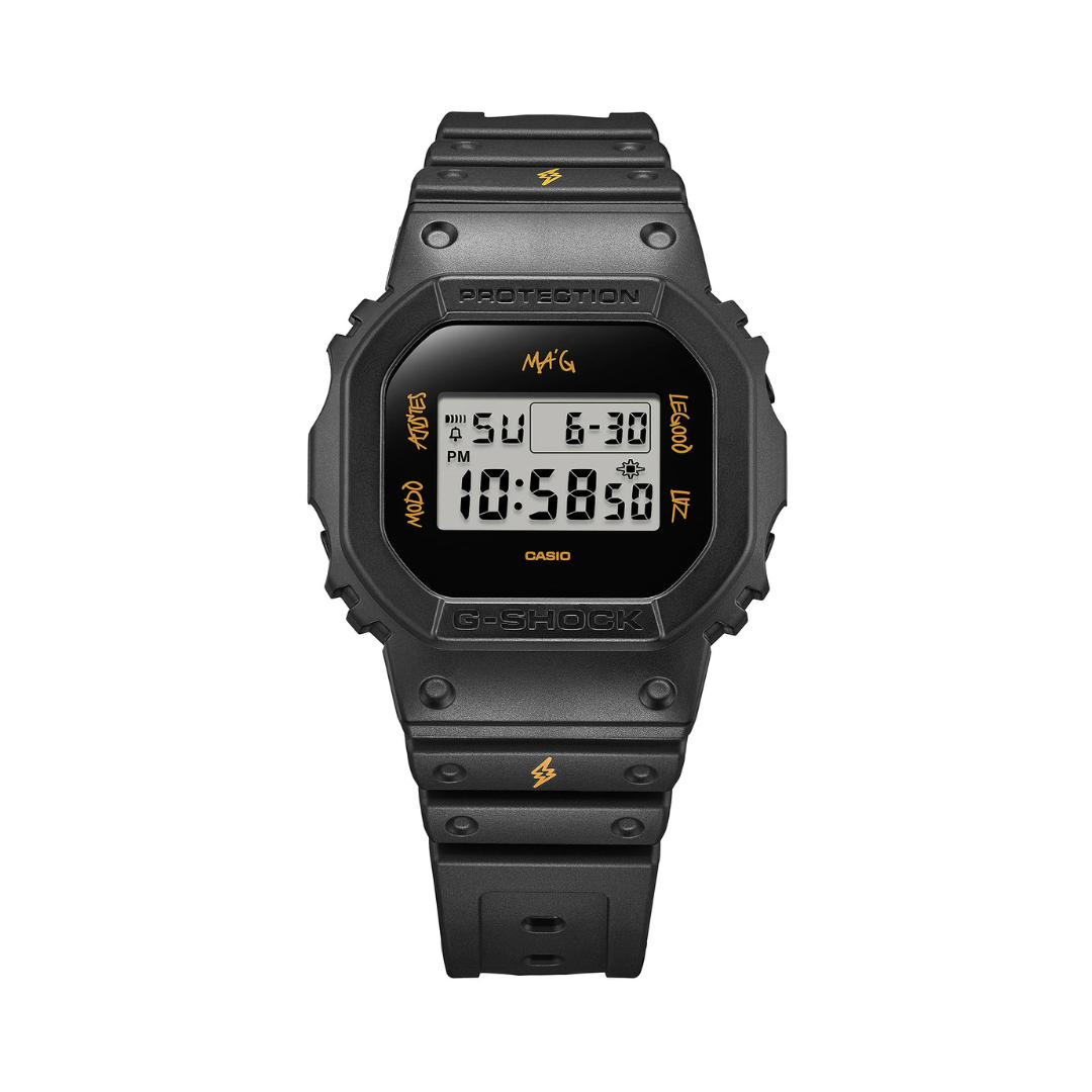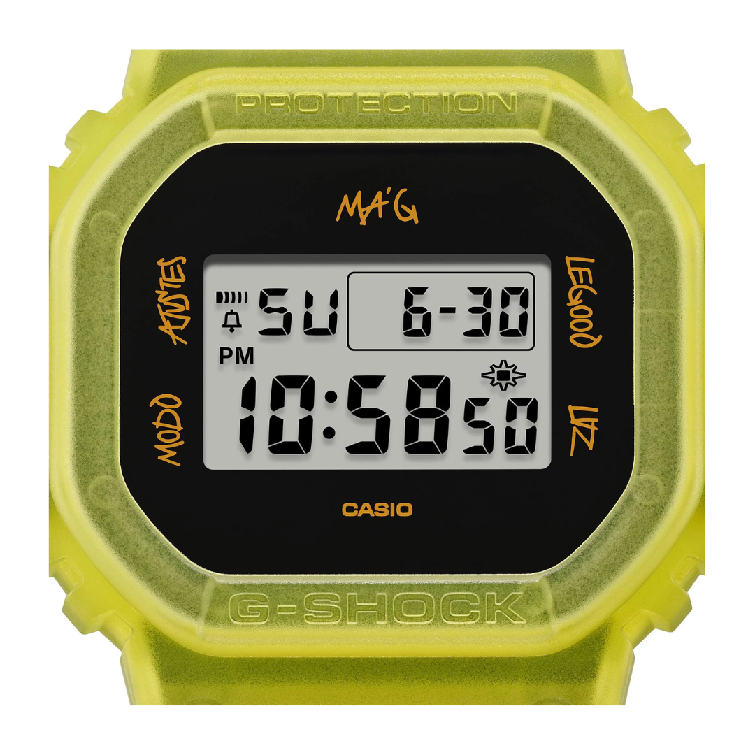 El MA G-SHOCK DWE-5600 lleva su esencia con el texto ‘MA’G’, indicadores escritos a mano en español y biseles intercambiables en amarillo mate translúcido y negro clásico. Detalles como el Lightning Bolt en la retroiluminación y un empaque especial hacen de este reloj una pieza única, reflejando la energía y autenticidad del artista.