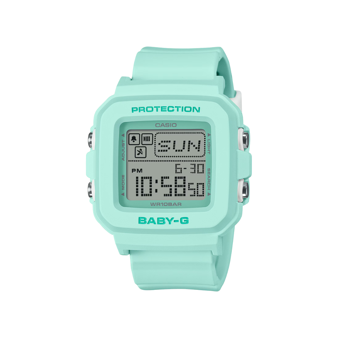 El estilo cuadrado de BABY-G que le encanta en un esquema de colores monocromático que adorará: un fantástico reloj digital para impulsar su vida activa y su estilo único. Presione el botón de luz en Modo de indicación de la hora para ver una animación pixel art aleatoria (surfista, bailarina, delfín, pez globo, perro, gato), que agrega un toque de diversión. Más que solo una encantadora declaración de moda, el BGD-10 también ofrece una estructura resistente a impactos, resistencia al agua hasta 100 metros y muchas funciones útiles.