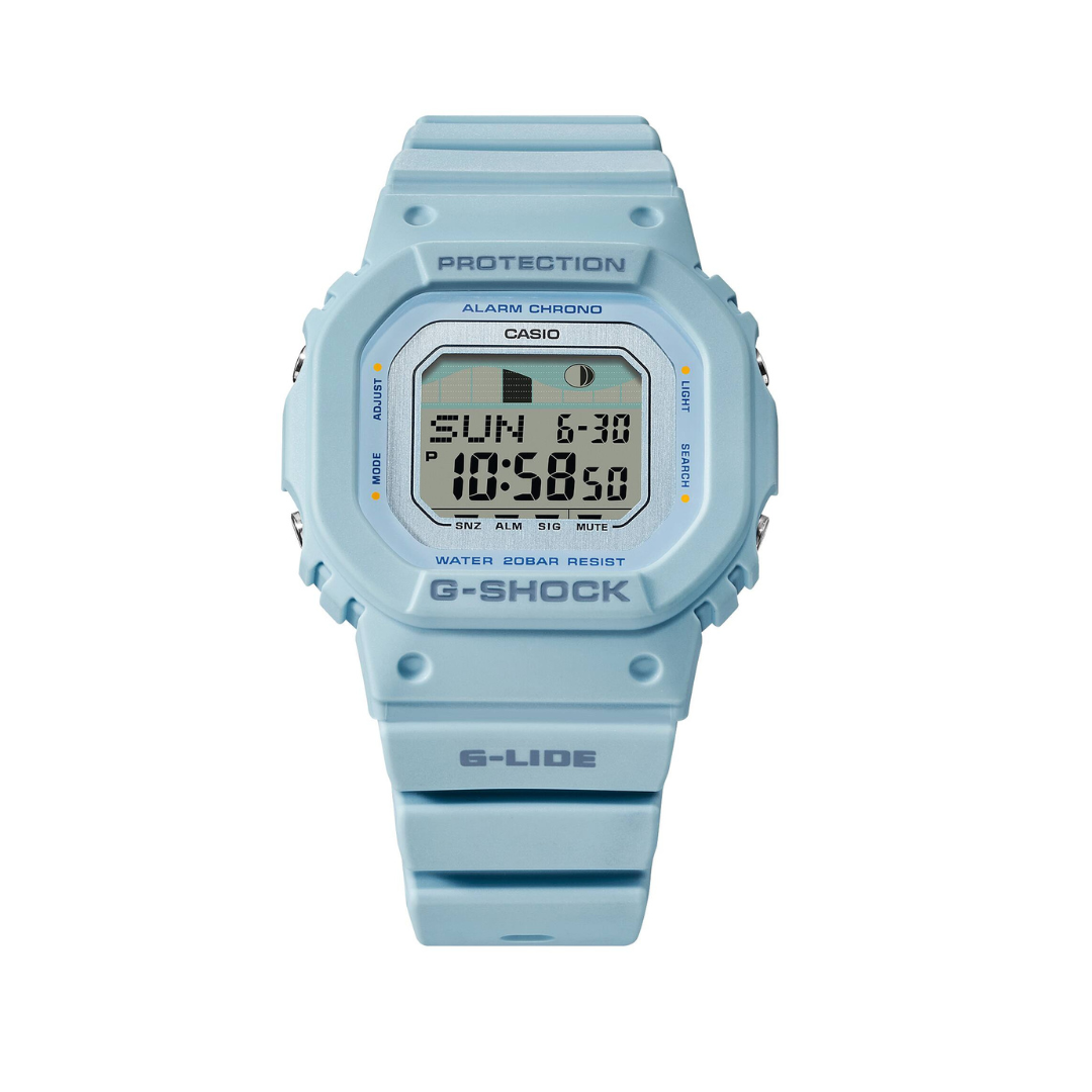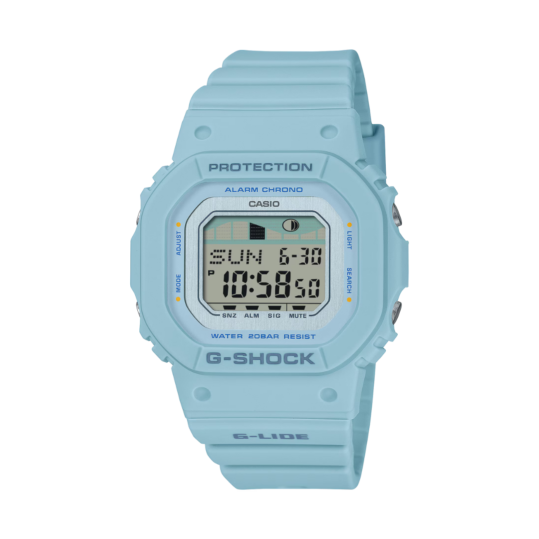 Disfrute del sol y vaya a la playa con un reloj G-LIDE con colores naturales, perfecto para cualquier escena de surf. El GLX-S5600, una versión ligeramente más pequeña del modelo básico G-LIDE, adopta colores terrosos y un diseño playero que recuerda a los viajes de surf que evocan una sensación de unidad con la naturaleza. Los componentes metálicos de la esfera, con acabado de líneas finas, representan las olas y se enmarcan en un cuerpo azul claro o blanco inspirado en las hermosas playas. Las prácticas funciones que todo surfista necesita, como gráficos de mareas y datos lunares, llegan directamente a tu muñeca, listas para surcar las olas en cualquier parte del mundo. La naturaleza está en primer plano con componentes clave de resina en el marco y la correa fabricados con resina de base biológica. Se espera que este material, producido con recursos orgánicos renovables, ayude a reducir el impacto ambiental.