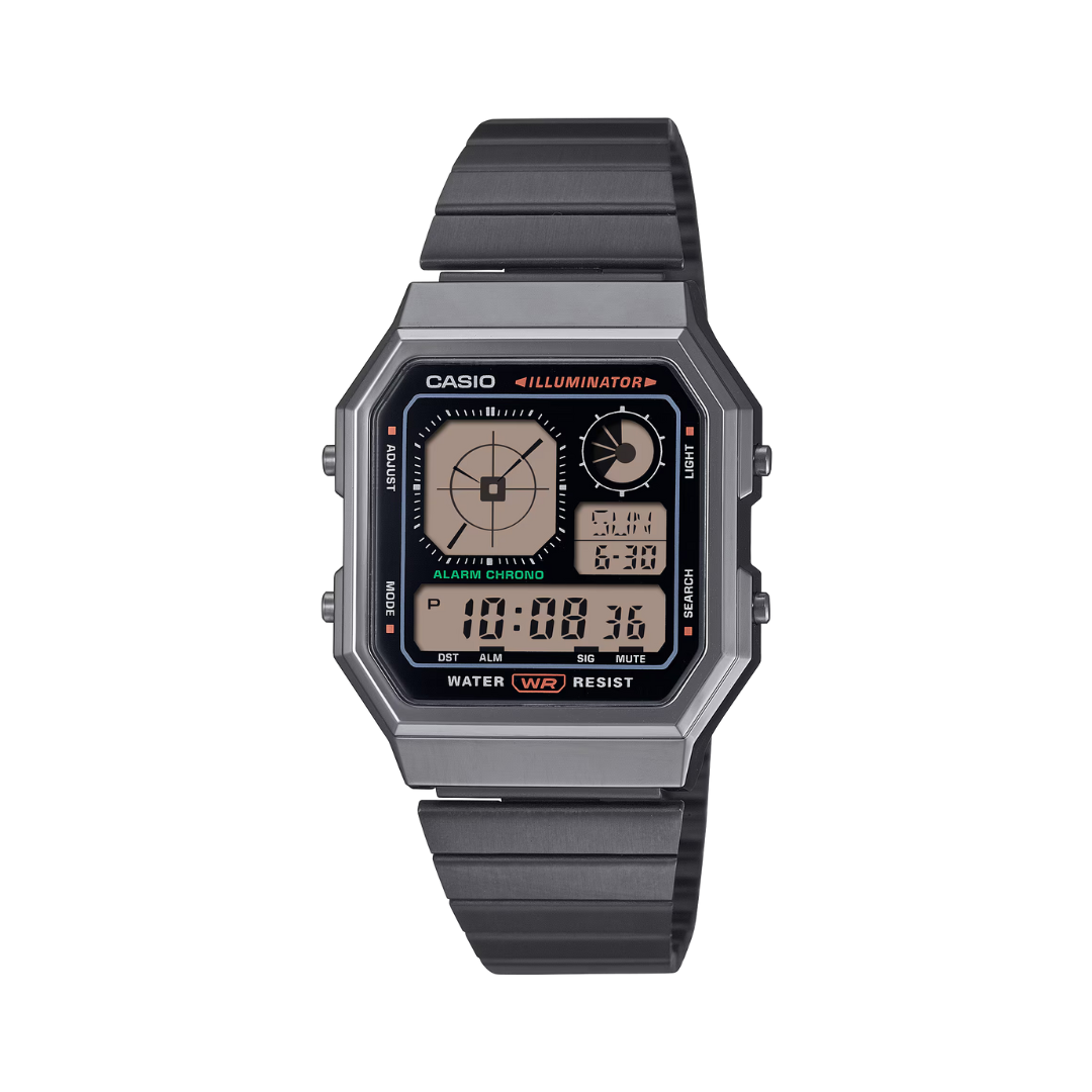 Una propuesta audaz, ecléctica y también funcional. Está equipado con funciones prácticas como resistencia al agua para uso diario, luz LED, cronómetro, alarma y mucho más.