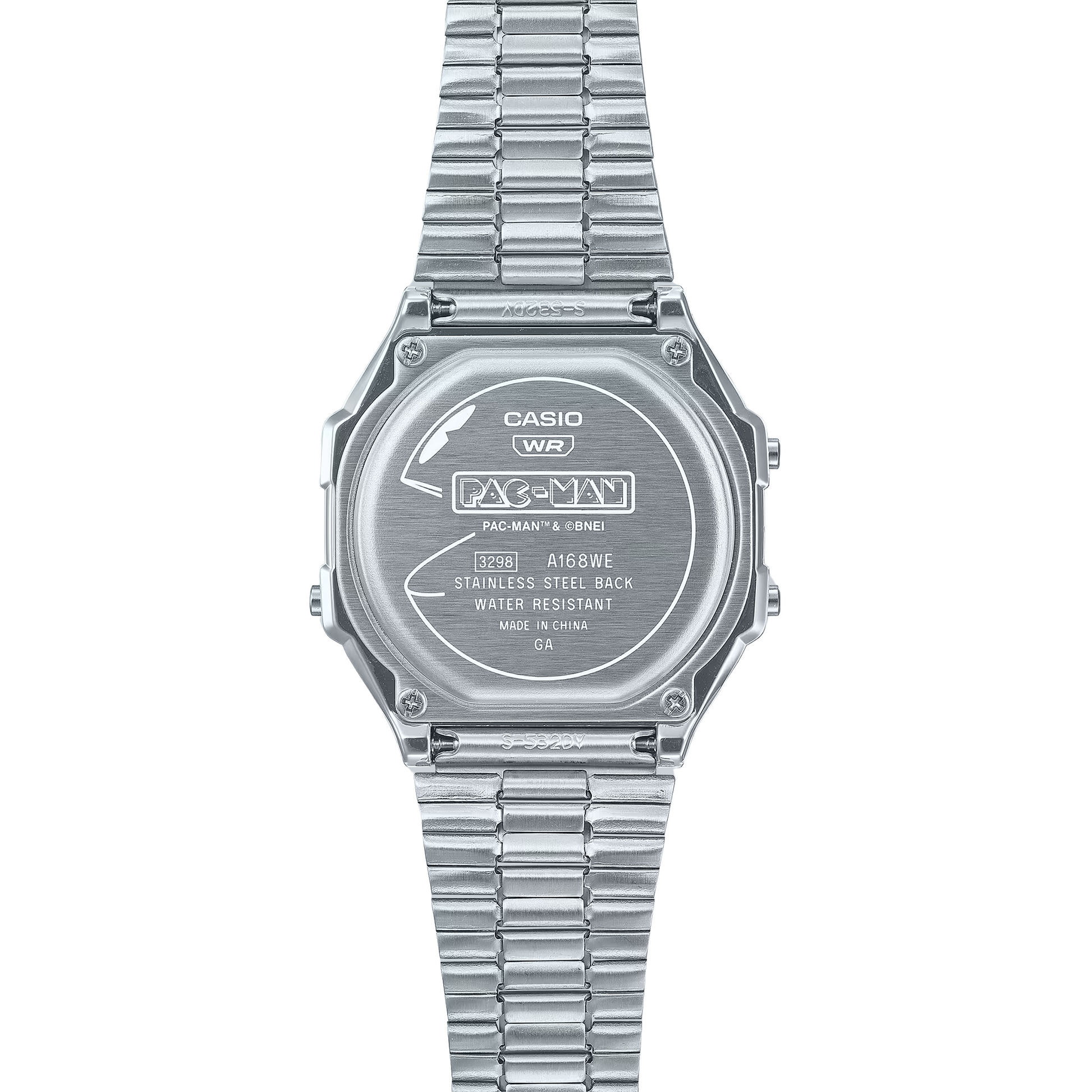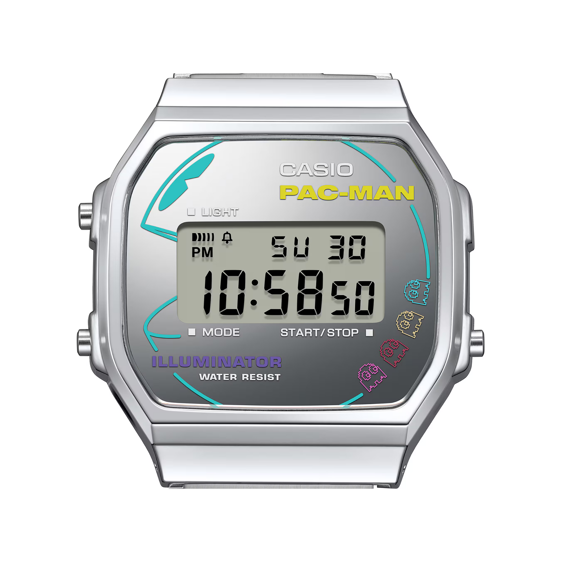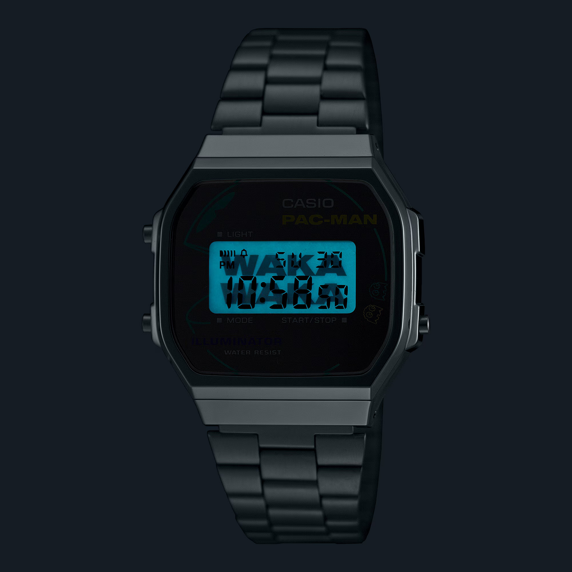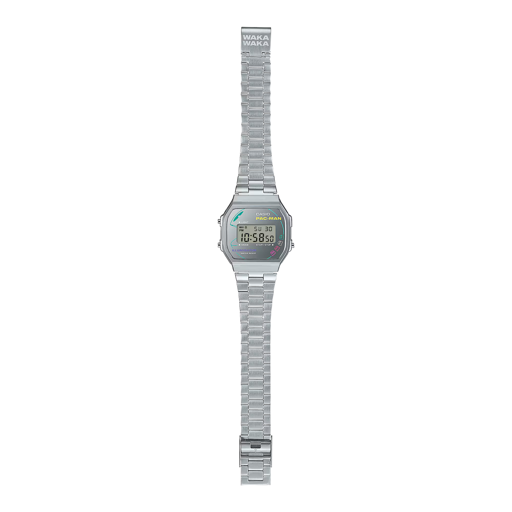 Este modelo presenta una esfera plateada tratada con deposición de vapor, adornada con gráficos de PAC-MAN y los cuatro fantasmas (Blinky, Pinky, Inky y Clyde) en colores neón vibrantes, evocando la estética retro del juego. El sonido característico de PAC-MAN al comer las píldoras, “WAKA WAKA”, está representado tanto en la cubierta del cierre como en la pantalla LCD cuando se activa la retroiluminación, añadiendo un toque lúdico al diseño. El reverso de la caja está grabado con la imagen de PAC-MAN y el logotipo del juego, y el reloj se presenta en un empaque especial con diseño neón, lo que lo convierte en una pieza de colección para los entusiastas de los videojuegos y la moda retro.