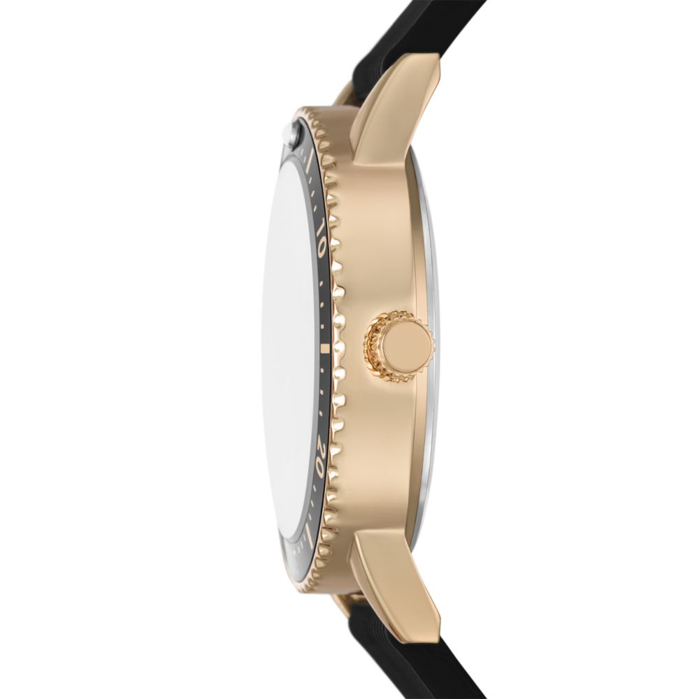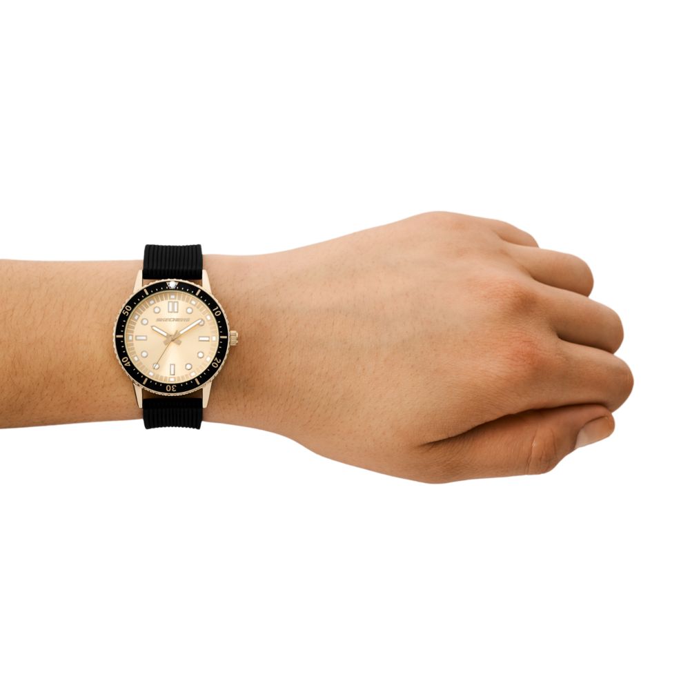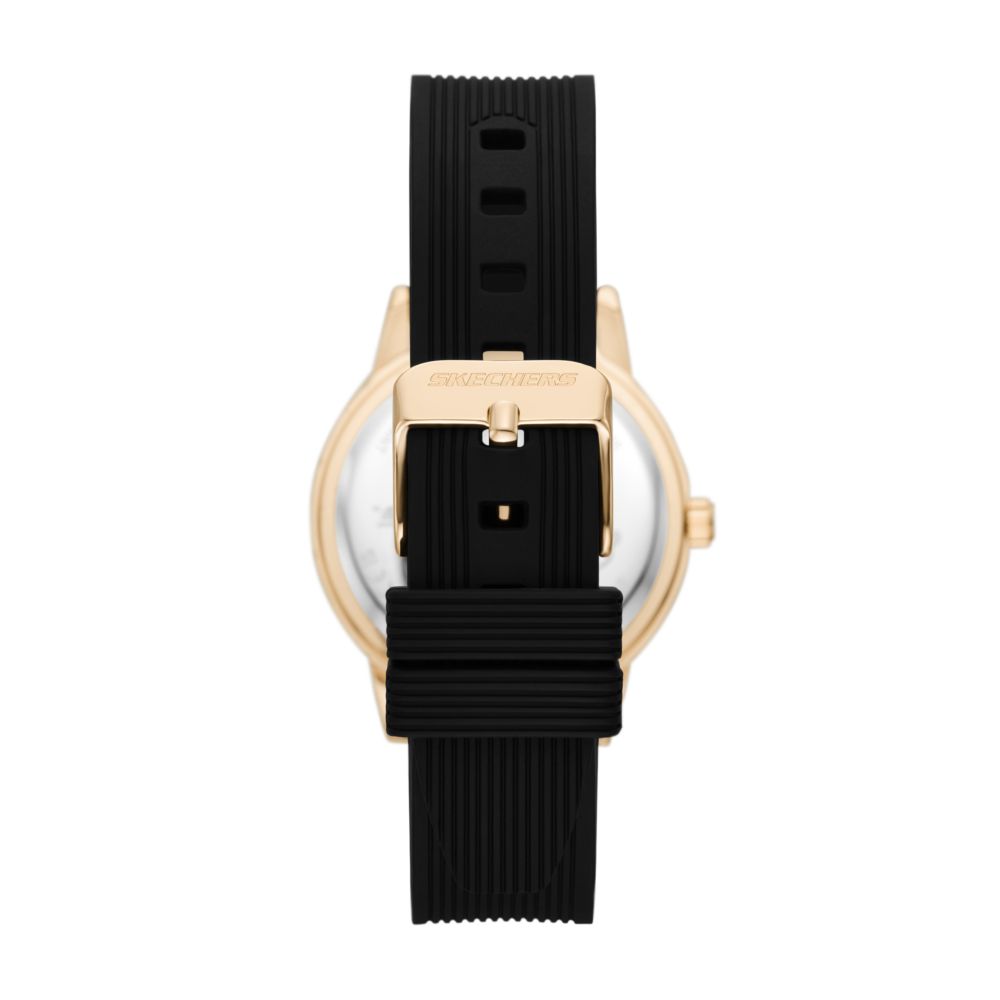 Perfecto para el uso diario, el reloj Skechers Carolwood para mujeres presenta una correa de silicona texturizada negra y caja de metal en tono dorado con bisel de aluminio negro. Manecillas e índices luminosos hacen de este un reloj de tres manecillas fácil de leer.