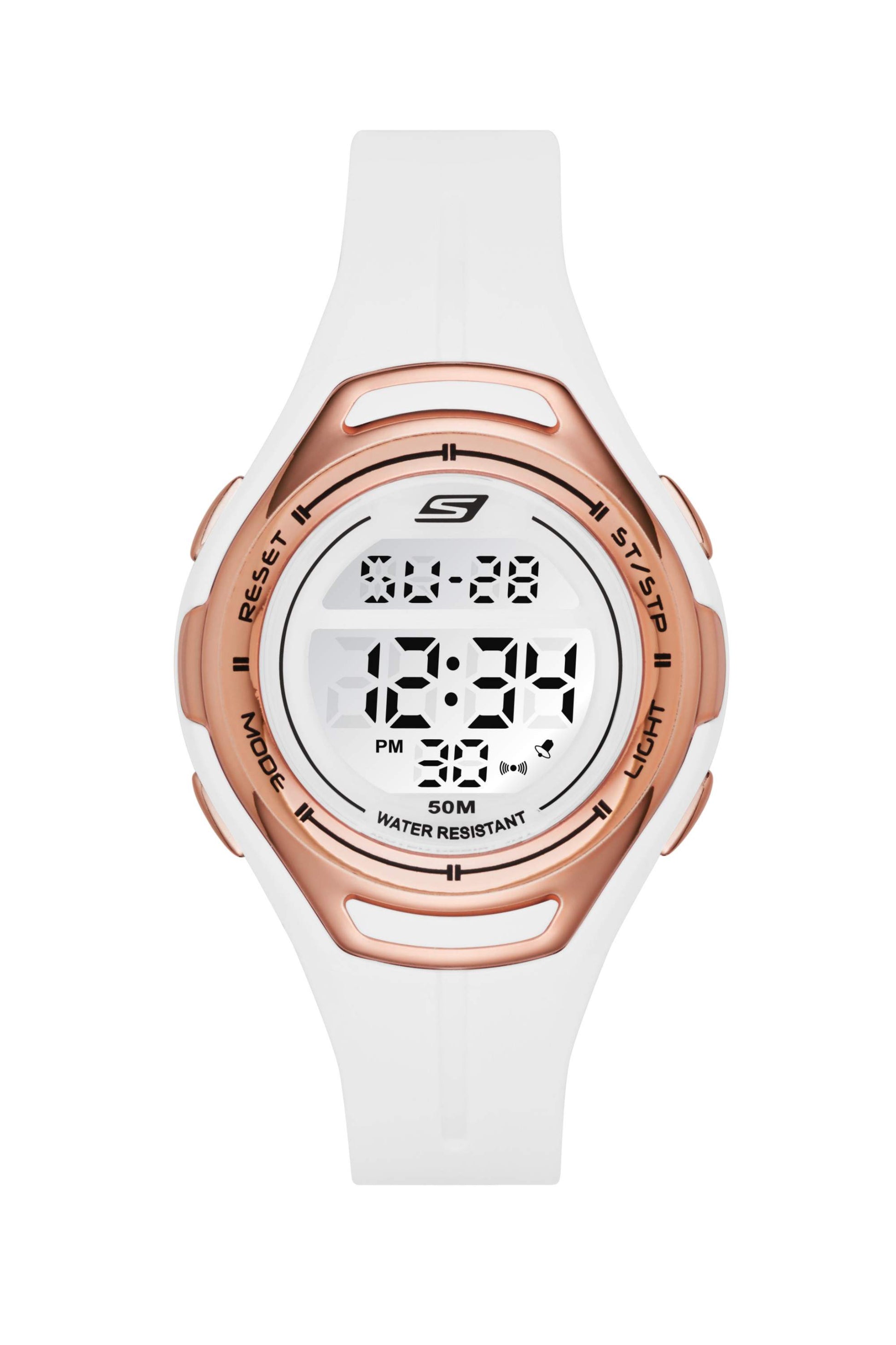 Mantén un estilo deportivo y elegante con el reloj Skechers Artesia, que presenta una caja de plástico blanca con detalles en tono oro rosa, una correa de plástico blanco y una pantalla digital cronógrafo positiva que incluye calendario, alarma diaria y campana, hora dual, cronómetro y retroiluminación.
