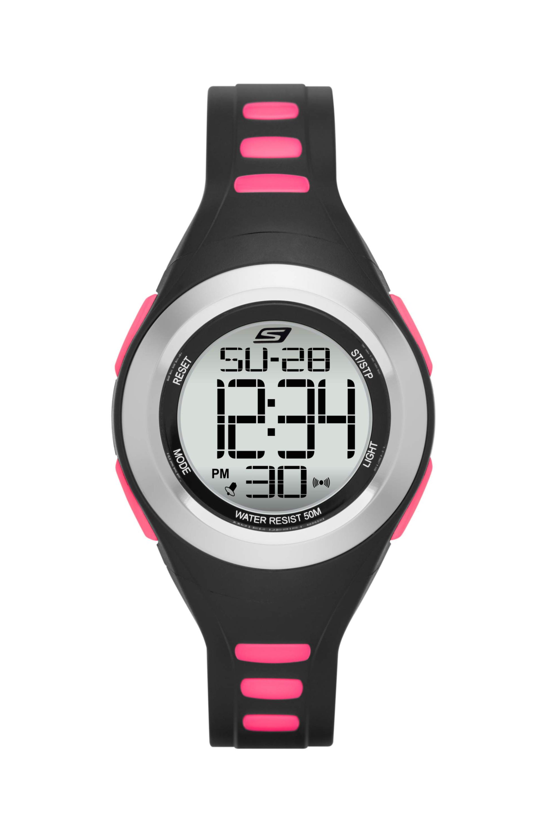 Mantén tu aspecto deportivo e inteligente con el reloj Skechers Tennyson. Presenta una correa de silicona negra, bisel de metal y toques de color rosa. La pantalla digital positiva incluye cronómetro, formatos de 12-24 horas y hora dual, calendario y alarma diaria, así como retroiluminación.