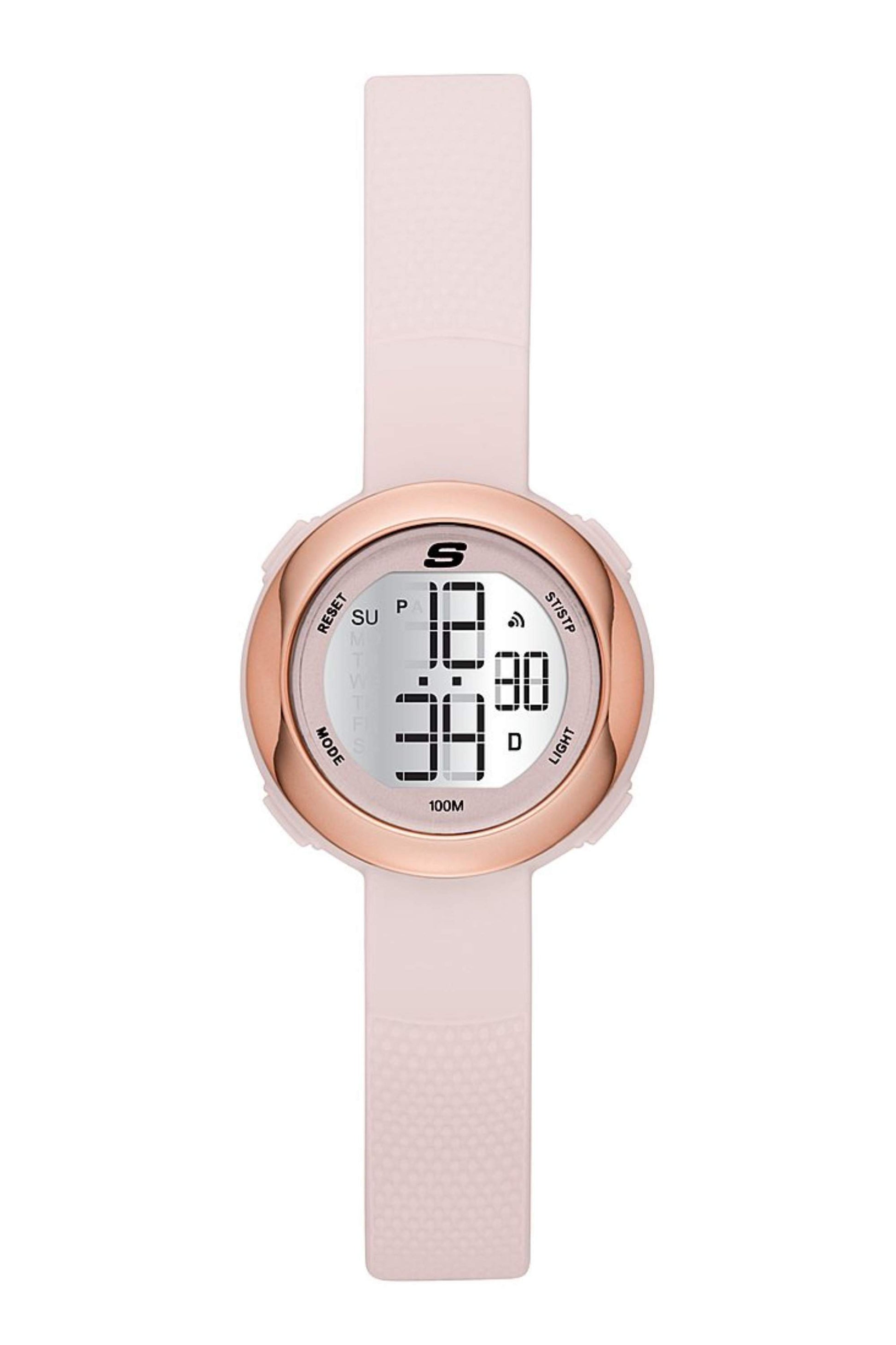 Este reloj Sunridge de 28.5 mm presenta una esfera digital, bisel en tono oro rosa y correa de silicona color rubor.