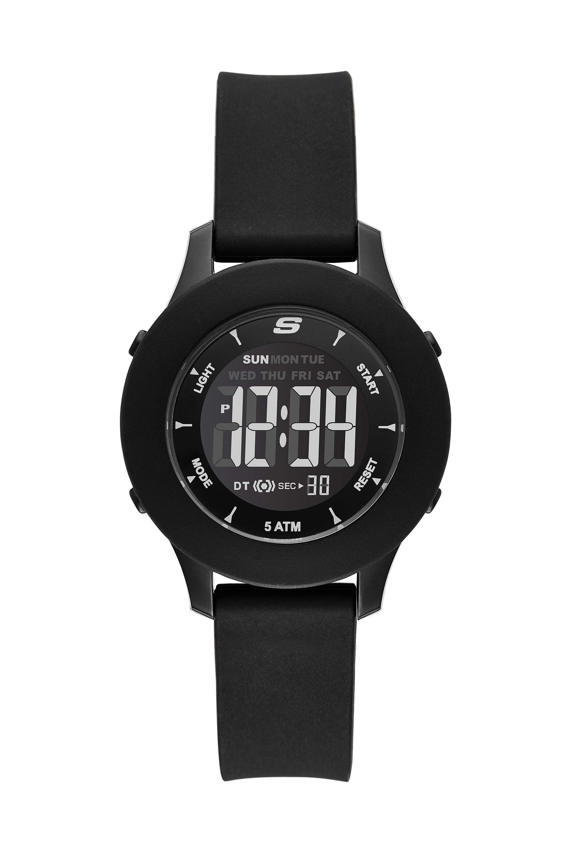 El reloj digital Skechers Rosencrans captura el estilo icónico de Skechers en negro. Presenta una caja de plástico con acabado brillante, correa de silicona y una pantalla digital negativa. Las funciones incluyen formato de hora de 12-24 horas, alarma diaria y retroiluminación.