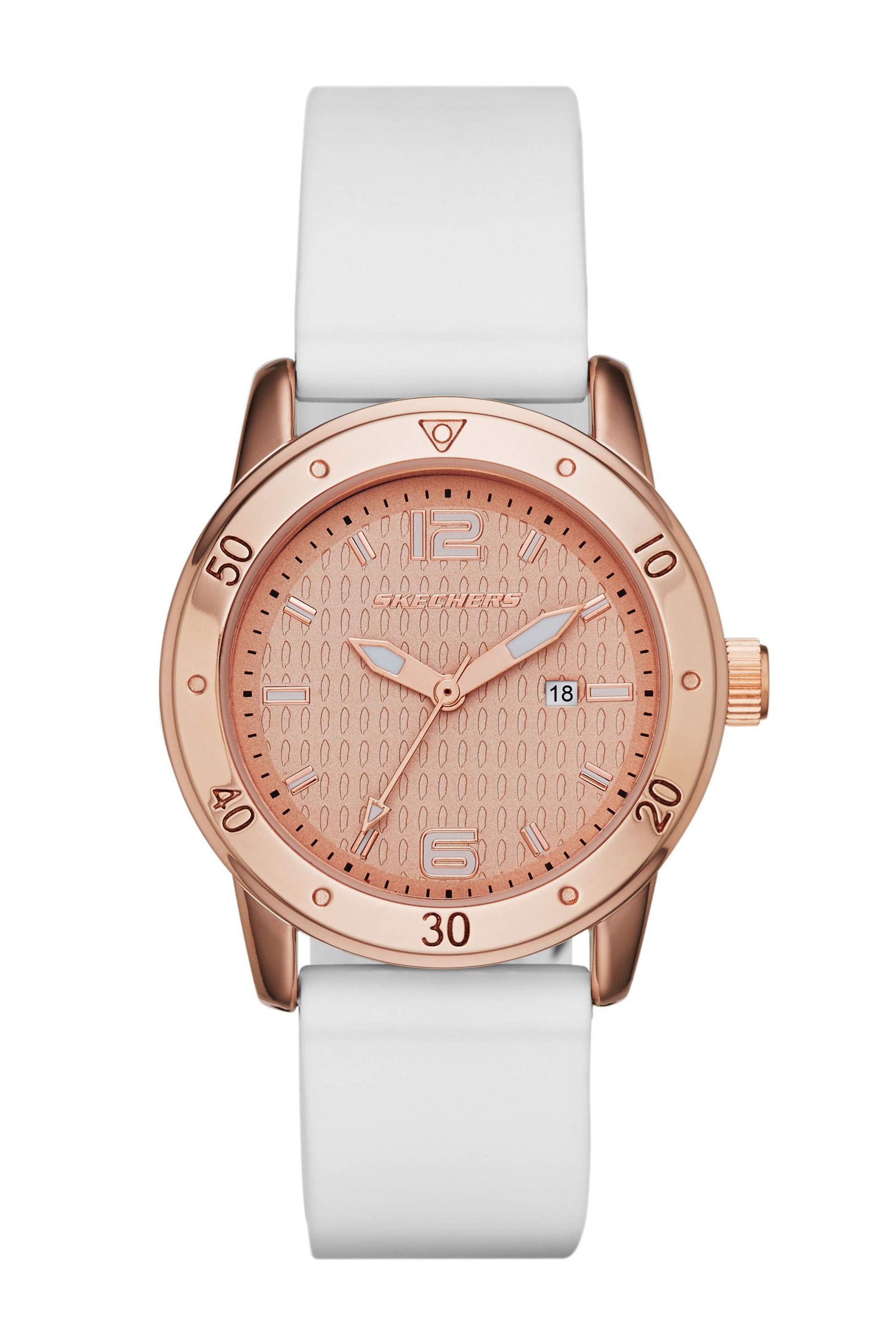 Este reloj Skechers Redondo inspirado en el buceo presenta una caja de metal pulido en tono oro rosa, correa de silicona blanca y ventana de fecha.