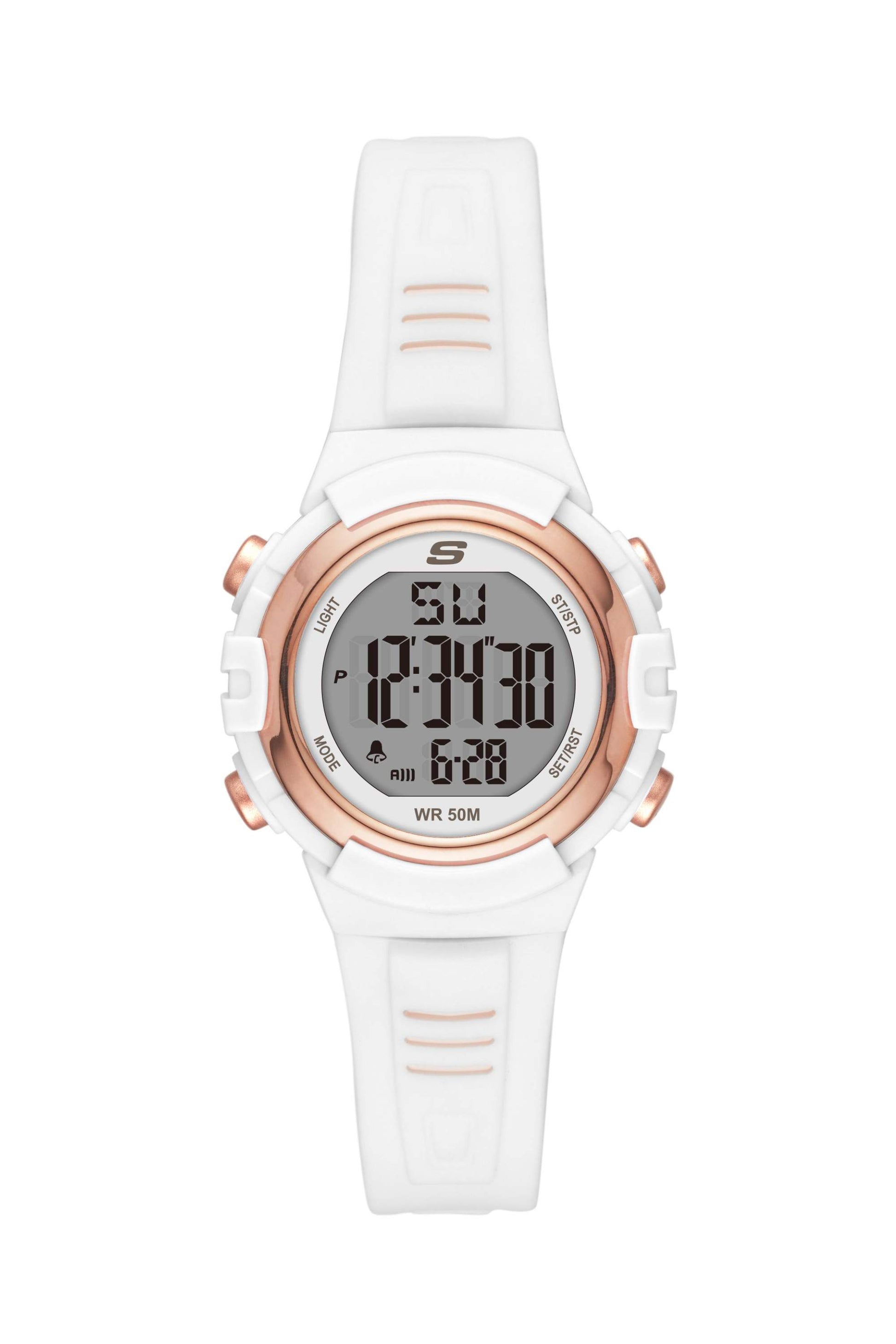 Con una caja y correa de plástico blanco, el reloj de pantalla positiva Skechers Truro presenta una alarma diaria, campana, cronómetro de 1/100 con control de vuelta/división, formato seleccionable de 12-24 horas y retroiluminación, para un estilo adecuado para el trabajo y una función amigable para el gimnasio.